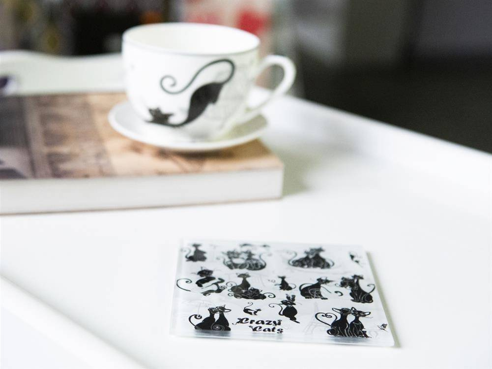 Gustowna, kwadratowa podkładka pod kubek z kocim motywem. Wykonana ze szkła, przez co bardzo łatwo ją umyć. Zabezpieczona silikonowymi nóżkami. Unikalny design i staranne wykonanie sprawi, że podkładki podkreślą wystrój każdego wnętrza.