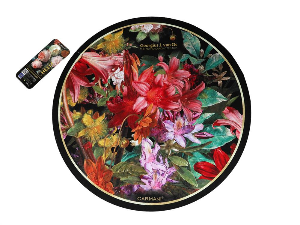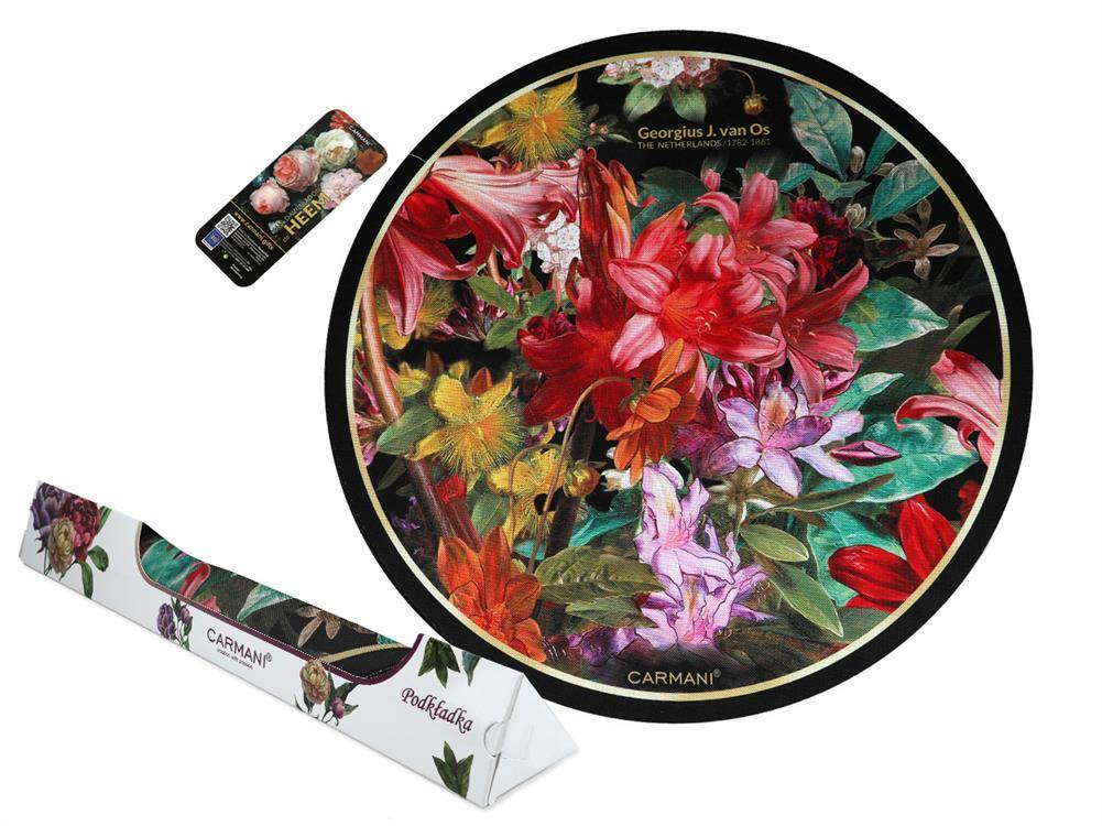 Okrągła podkładka pod talerz ozdobiona niezwykle bogatą kompozycją kwiatową, to doskonały dodatek do każdego wnętrza. Nie tylko zabezpieczy stół przed zarysowaniami, ale wprowadzi do wnętrza bogaty, pełen przepychu charatkter.