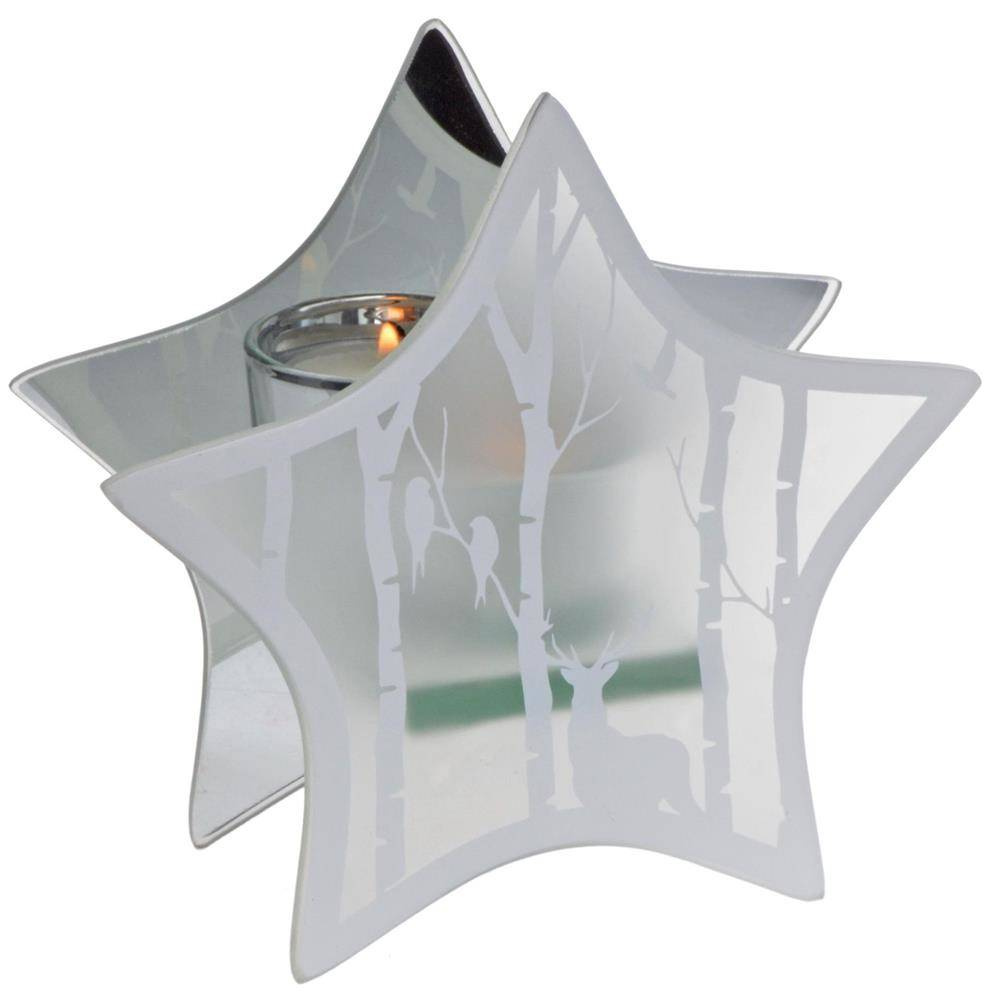 Szklany świecznik na tealighta z białymi drzewami i reniferem. Lustro odbija, a mleczne szkło rozprasza światło co daje przyjemny, nastrojowy efekt.