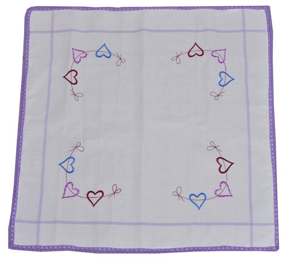Obrus z wyszytymi sercami, wykończony fioletową koronką.