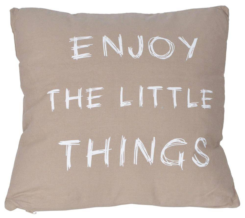 Beżowa poduszka z białym napisem "Enjoy the little things".