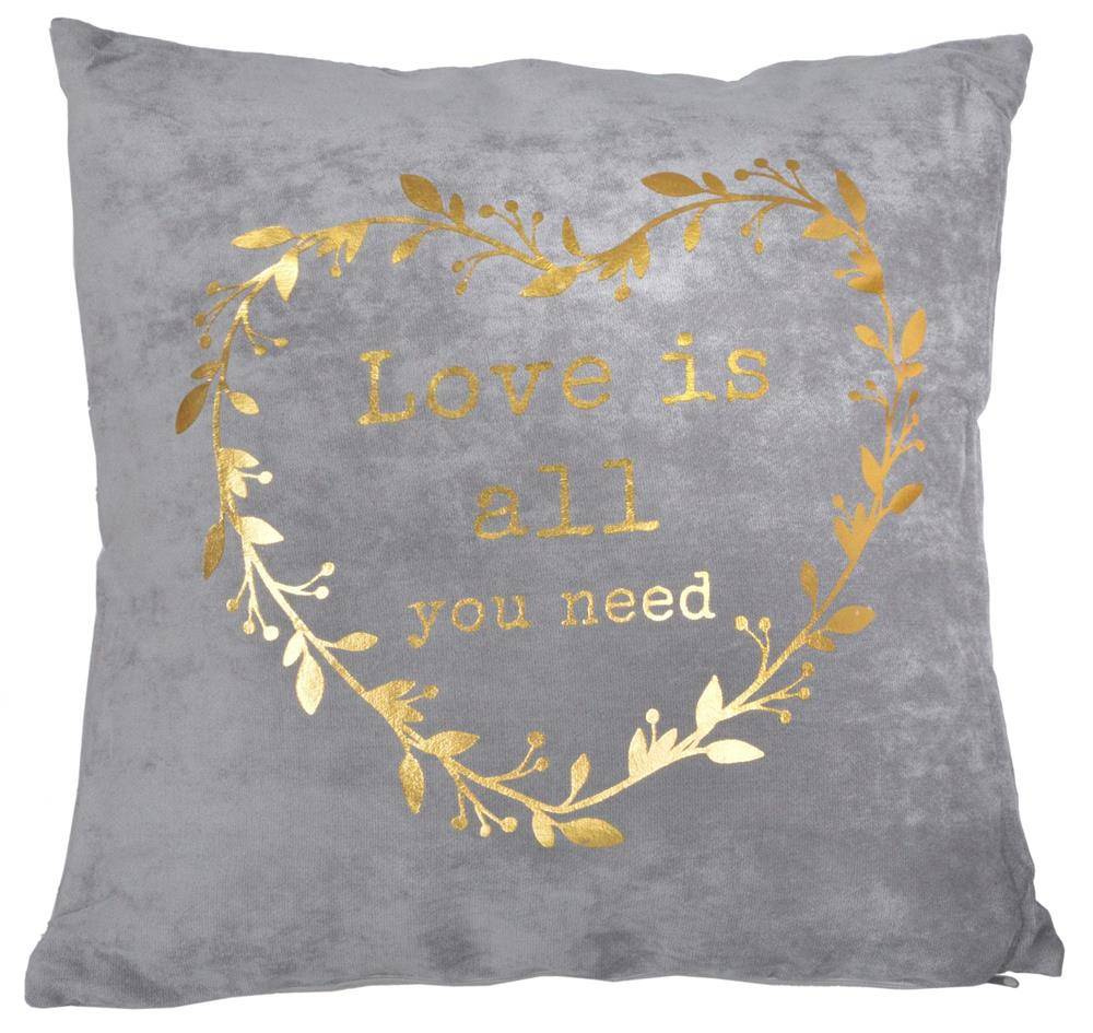 Szara poduszka ze złotą aplikacją z napisem "Love is all you need".