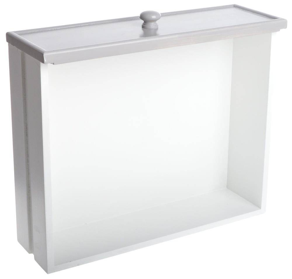 Półka w formie szuflady z szarym frontem. Z tyłu mocowanie ułatwiające powieszenie na ścianie.