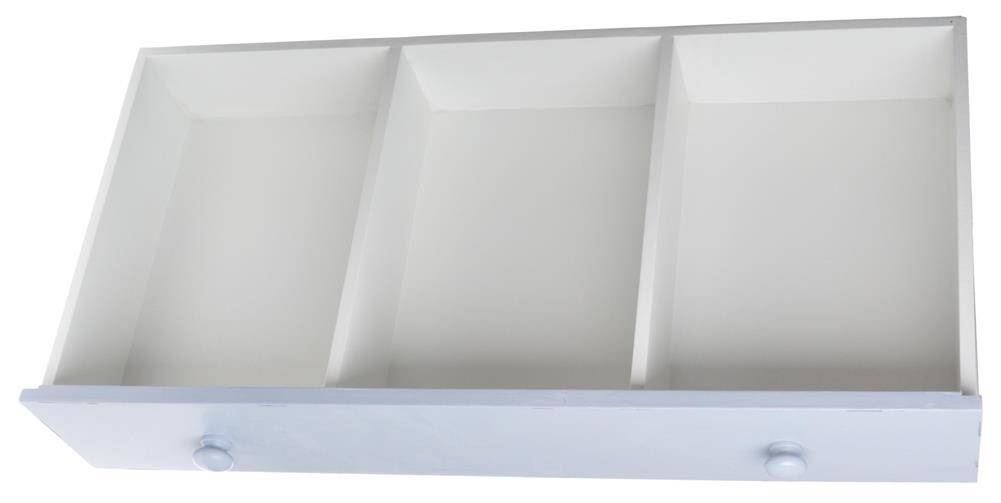 Potrójna półka w formie szuflady z błękitnym frontem. Z tyłu mocowanie ułatwiające powieszenie na ścianie.