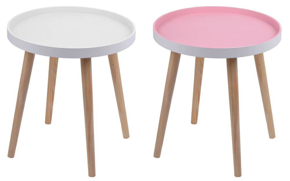 Stolik drewniany z różowym lub białym blatem na czterech nogach.