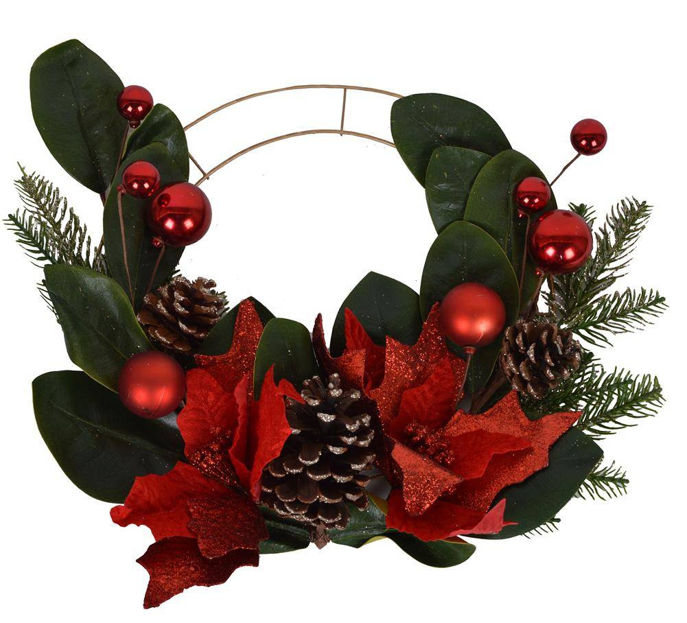 Obręcz złota metalowa z kwiatem gwiazdy betlejemskiej, szyszkami i bombkami