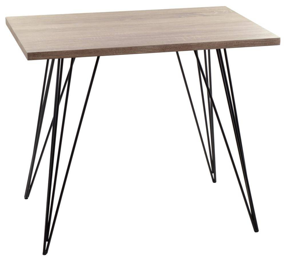 Stolik z laminowanym blatem i czarnymi, metalowymi nogami.