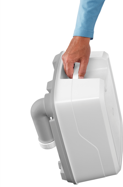Ogranicznik na zbiorniku na nieczystości utrzymuje rurę spustową we właściwym miejscu, dzięki czemu dwa zbiorniki można po prostu zatrzasnąć.
