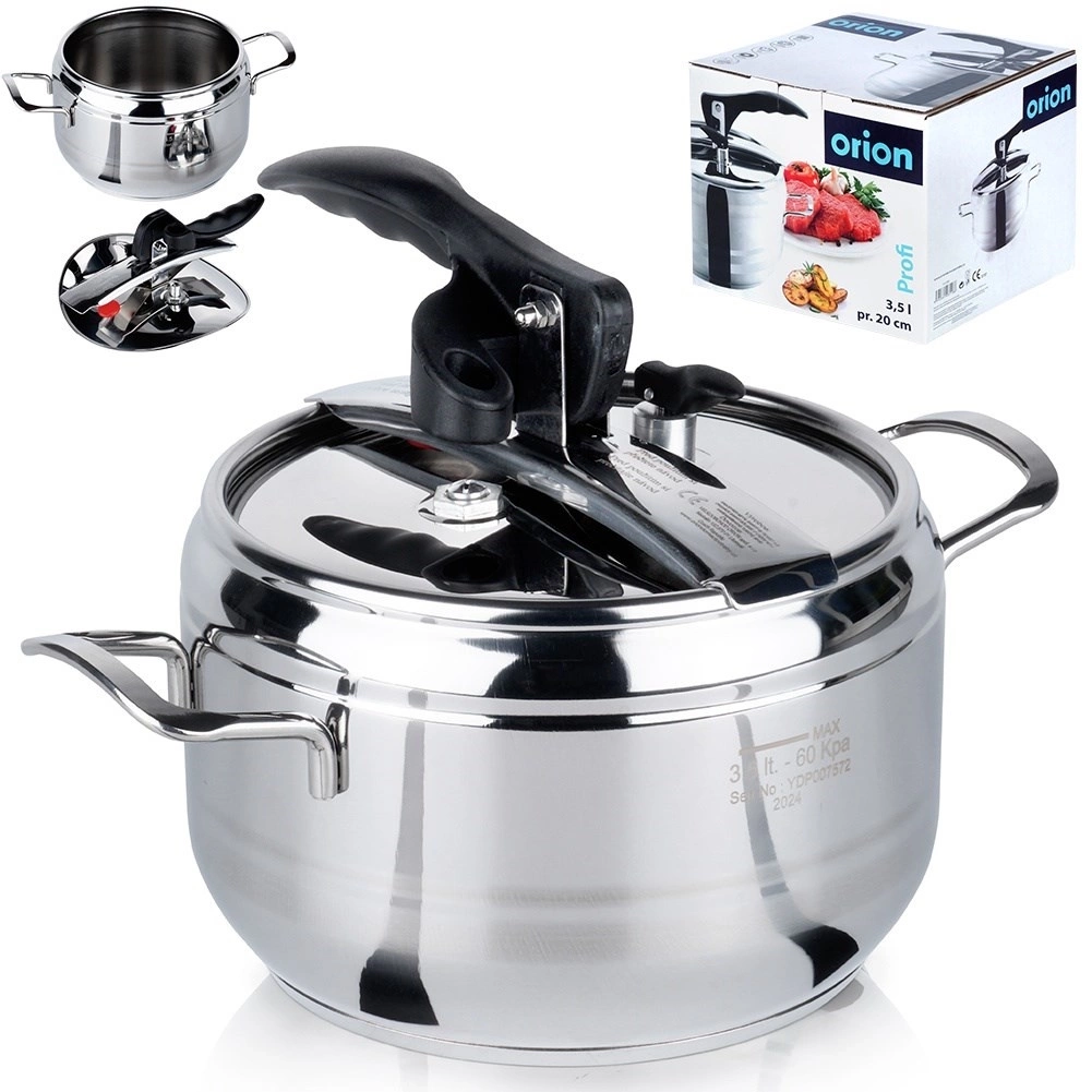 Szybkowar o pojemności 3,5 litrów. Podana pojemność szybkowaru dotyczy pojemności całkowitej naczynia. Pojemność szybkowarowa to 2/3 pojemności całkowitej. Z jego pomocą będziemy mogli przygotować pyszne potrawy w znacznie krótszym czasie. Szybkowar jest łatwy w obsłudze i bezpieczny. Oryginalny produkt czeskiej marki Orion. Wyprodukowano zgodnie z europejskimi standardami.
