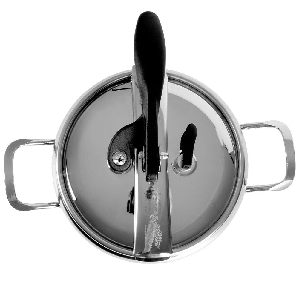 - BEZPIECZNY - Korzystanie z szybkowaru jest bezpieczne, dzięki wbudowanym dwóm zaworom bezpieczeństwa. Możliwość regulacji ciśnienia. Dzięki specjalnemu systemowi zamykania uszczelka nie zużywa się szybko.