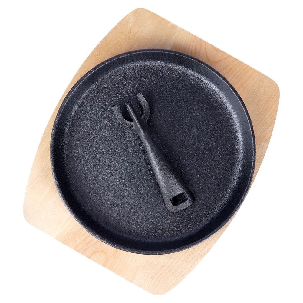 - Patelnia ma średnicę 22 cm i wysokość 2 cm, deska ma wymiary 27 x 23 cm, uchwyt 13 x 2,5 x 4 cm.