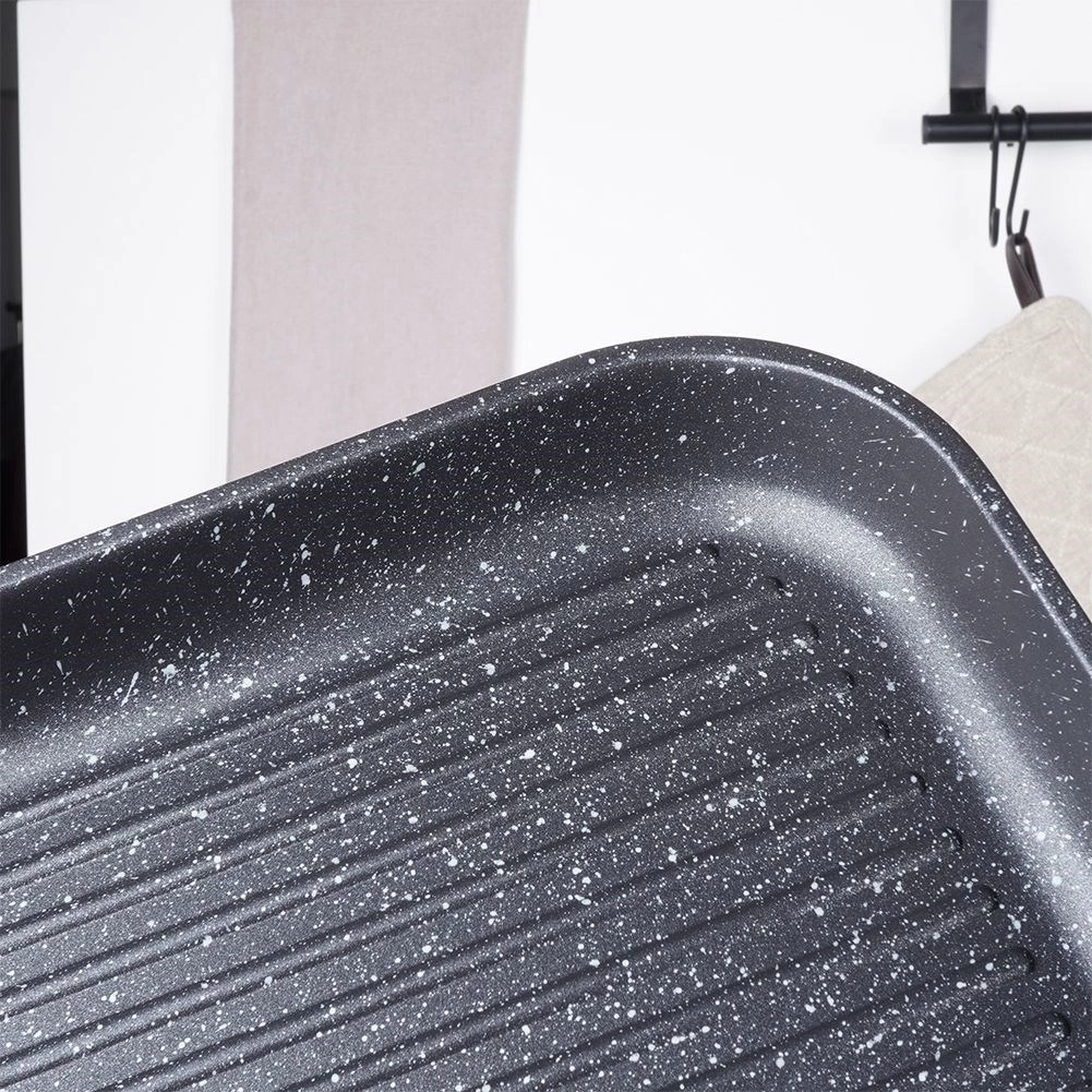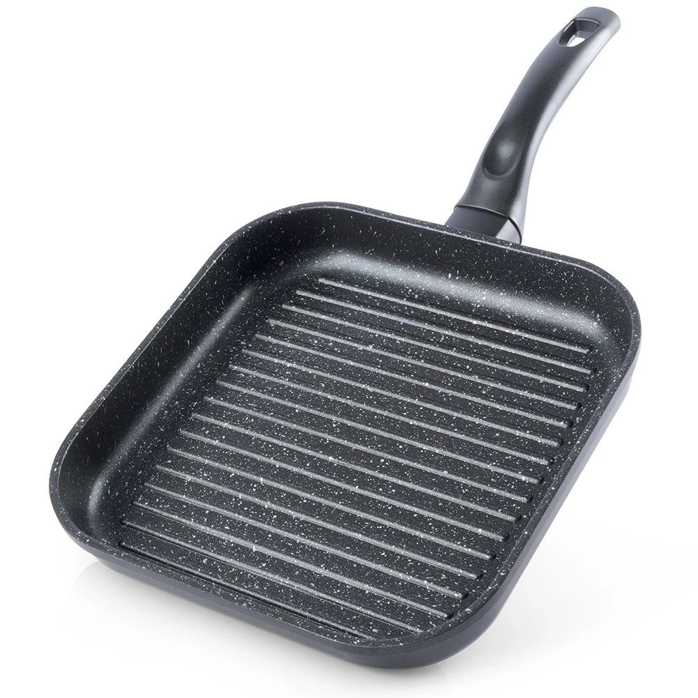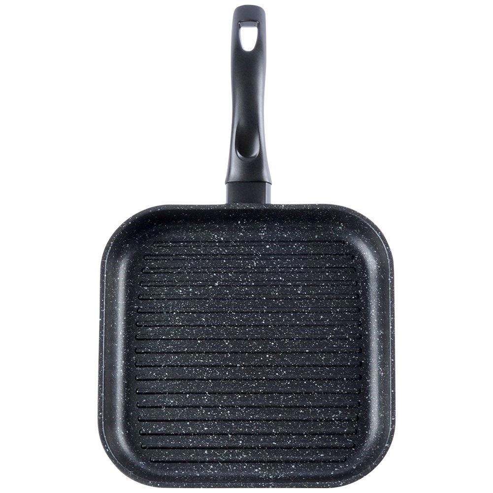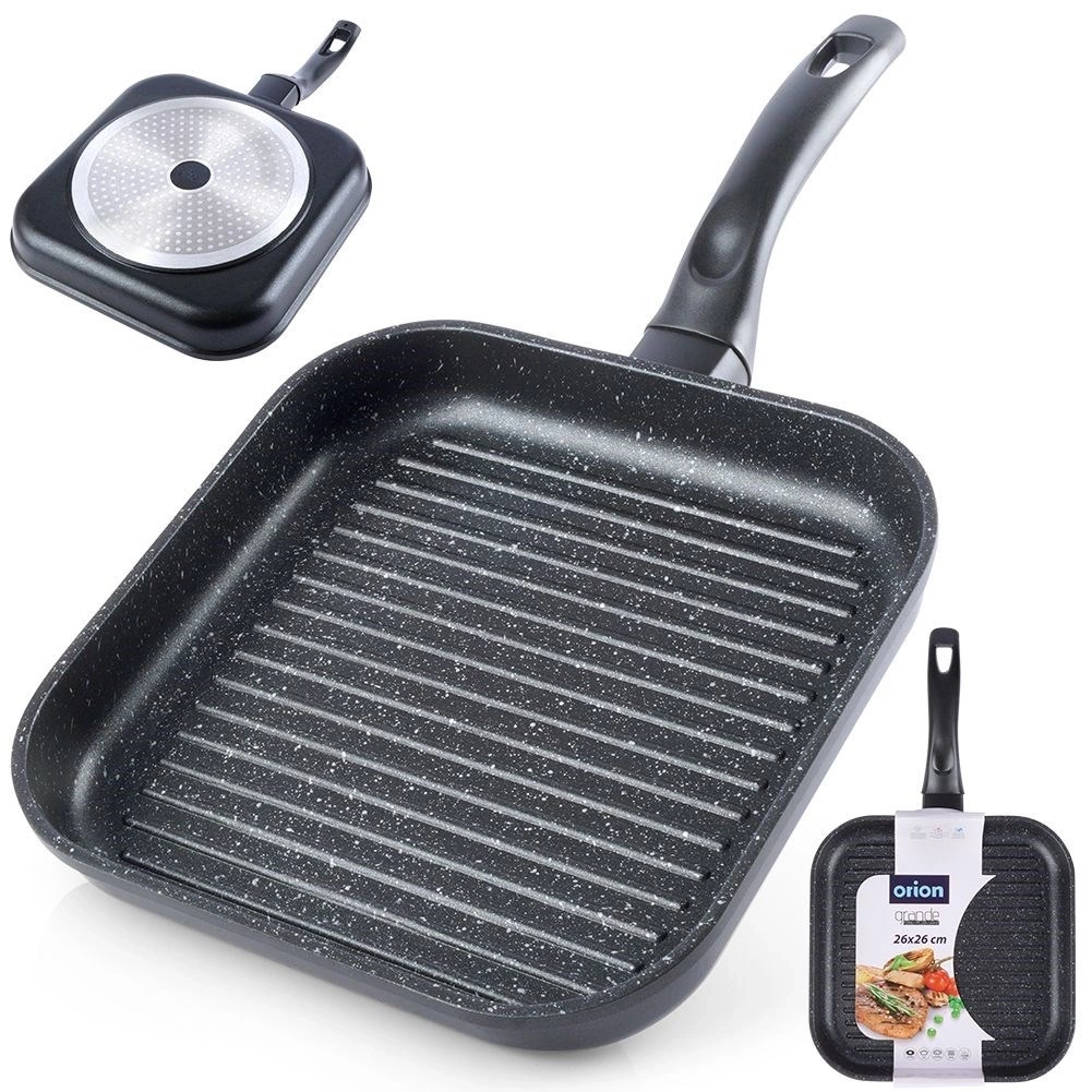 - Kwadratowa patelnia do grillowania z uchwytem z bakelitu.
