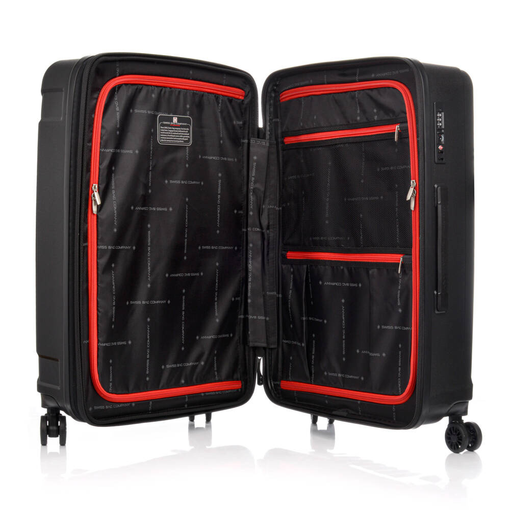 Wnętrze walizki jest podzielone na dwie części. Dolna komora posiada regulowane pasy, uniemożliwiające przesuwanie się bagażu. Całość dopełnia elegancka