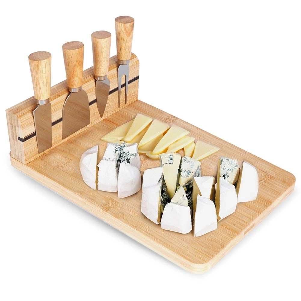 Deska w formie tacy do serwowania serów. Dodatkowo w zestawie 4 noże do dzielenia, cięcia oraz serwowania serów. Bambus z którego wykonano deskę jest odporny na wilgoć i odkształcenia, nie chłonie zapachów, szybko schnie. Drewno bambusowe jest materiałem ekologicznym i bezpiecznym dla zdrowia. Deska jest niezwykle efektowna, świetnie sprawdzi się podczas spotkań rodzinnych, imprez lub ważnych uroczystości. Z jej pomocą możemy w oryginalny sposób wyeksponować sery lub inne przekąski. Deska jest świetnym pomysłem na prezent dla miłośników sera i nie tylko. Łatwa w czyszczeniu i użytkowaniu. W celu odpowiedniej konserwacji nie zaleca się mycia w zmywarce do naczyń. Wyprodukowano zgodnie z europejskimi standardami.