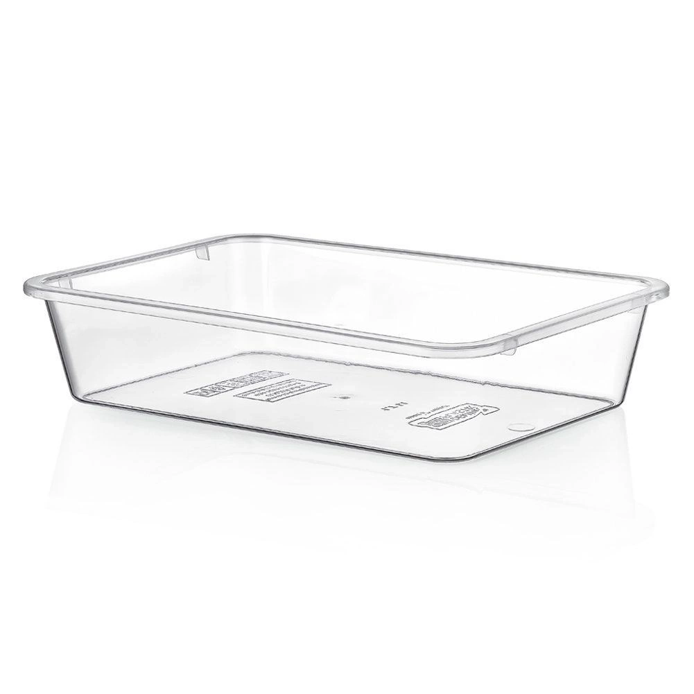 - Przezroczysty prostokątny pojemnik o wymiarach 35 x 25 x 7 cm i pojemności 4,5 litra.