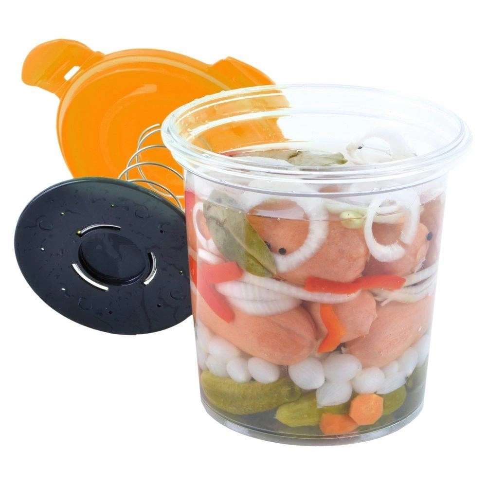 • Pojemnik do marynowania wyposażony w pokrywę sprężynową dzięki której możemy mocno ścisnąć marynowaną żywność.