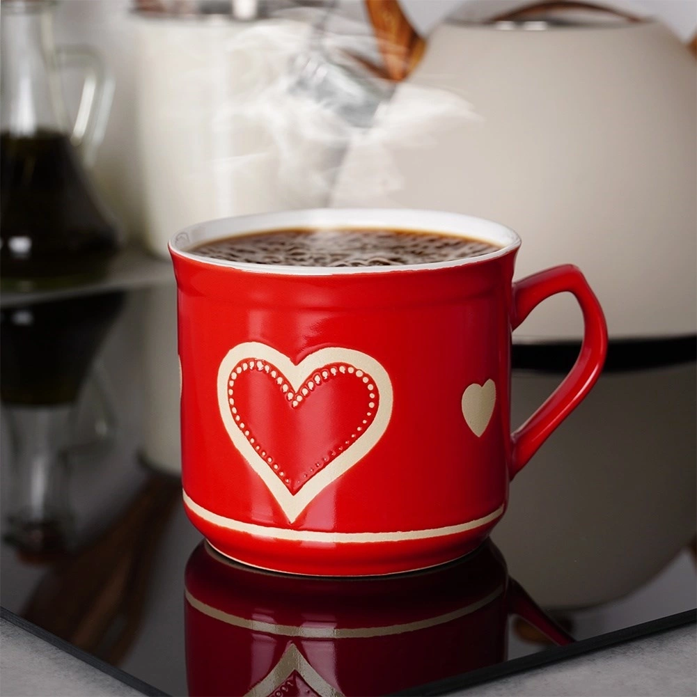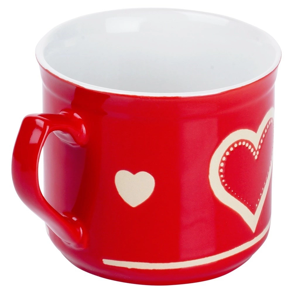 • SOLIDNY - Wykonany z najwyższej jakości ceramiki w kolorze czerwonym z pięknym dekorem w serca. Kubek będzie piękną dekoracją kuchni.