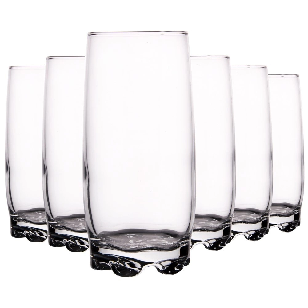• PRZYDATNE - Zestaw 6 sztuk szklanek do napojów. Każda ze szklanek ma pojemność maksymalną 370 ml. Wysokość szklanki wynosi 16 cm a średnica 6 cm.