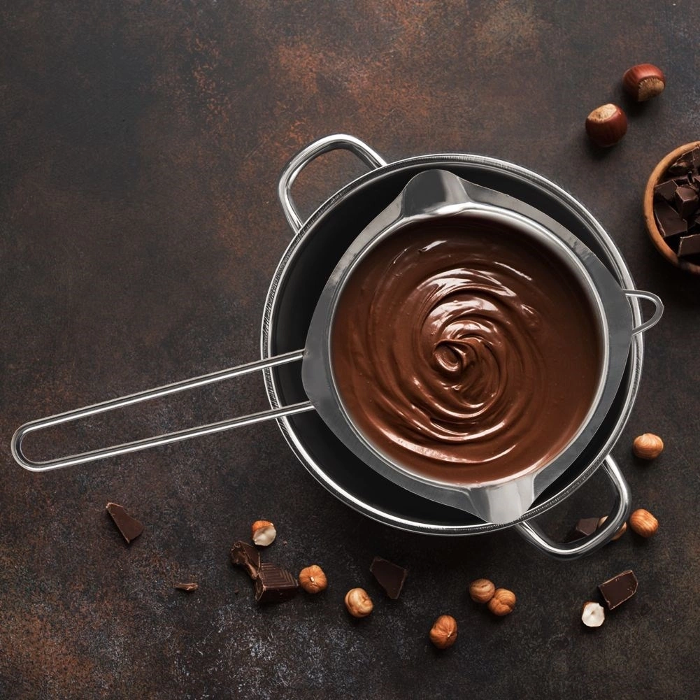 • Miska do rozpuszczania produktów w kąpieli wodnej. Posiada długi uchwyt oraz haczyk, który pozwala wygodnie umieścić miskę w innym naczyniu. Dziubki po bokach ułatwiają przelewanie.