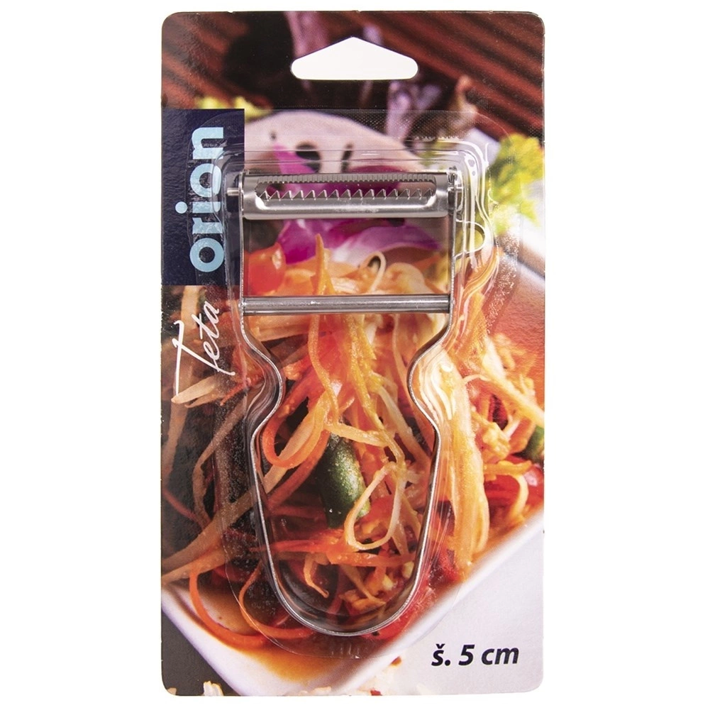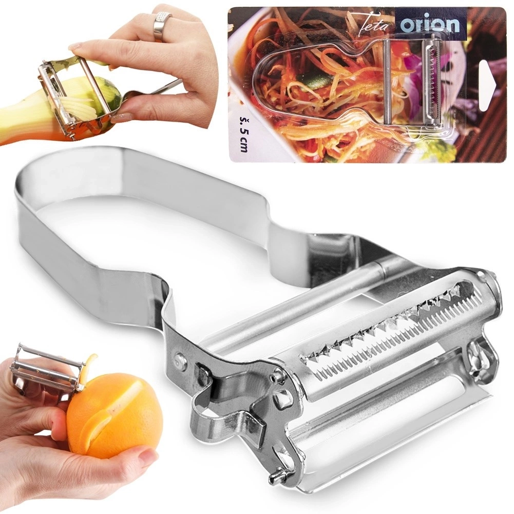 - Posiada dwa ostrza - jedno do klasycznego obierania, drugie do wycinania podłużnych pasków.