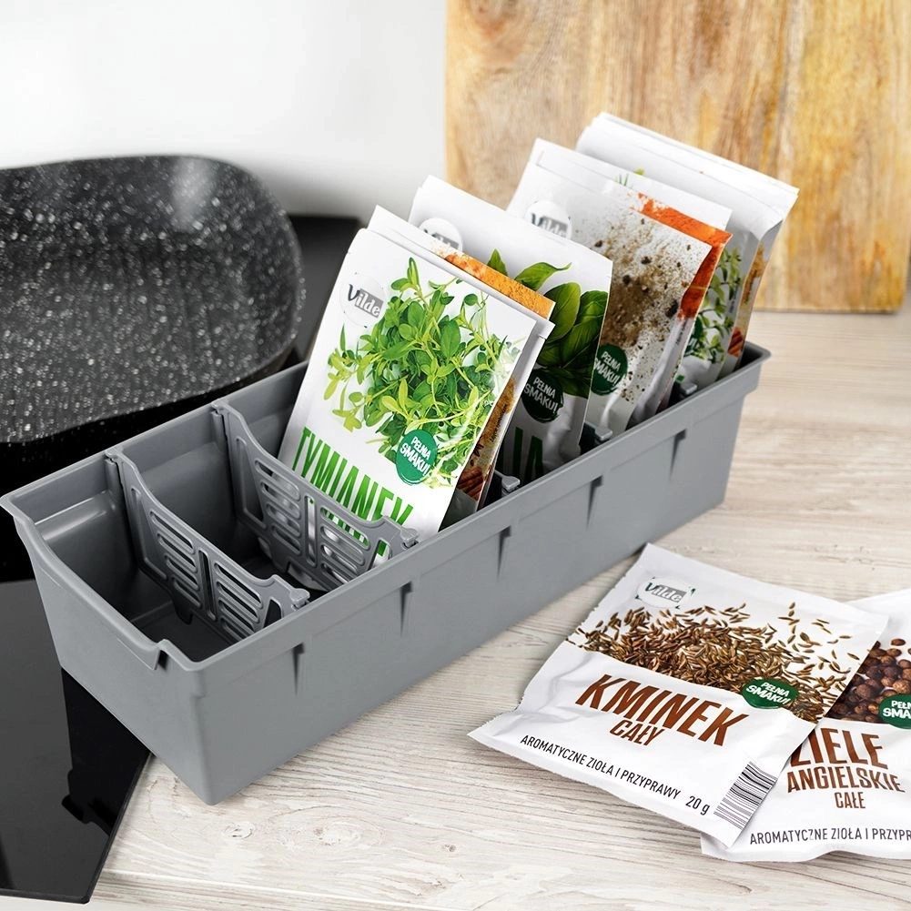 Pojemnik kuchenny z przegródkami o wymiarach 30 x 13 x 8 cm. Organizer na przyprawy pozwoli uporządkować zarówno otwarte, jak i zamknięte torebki z przyprawami. Dzięki niemu posortujesz przyprawy i zawsze będziesz mieć dany produkt pod ręką. Szybko znajdziesz odpowiednią torebkę. Pojemnik pozwala utrzymać torebkę w przegródce, co zapobiega rozsypywaniu przypraw. Wykonane z najwyższej jakości tworzywa, posłużą przez długi czas. Przyprawy i zioła będą utrzymane w porządku, a jeden organizer pomieści wiele torebek różnorakich produktów. Wyprodukowano zgodnie z europejskimi standardami.