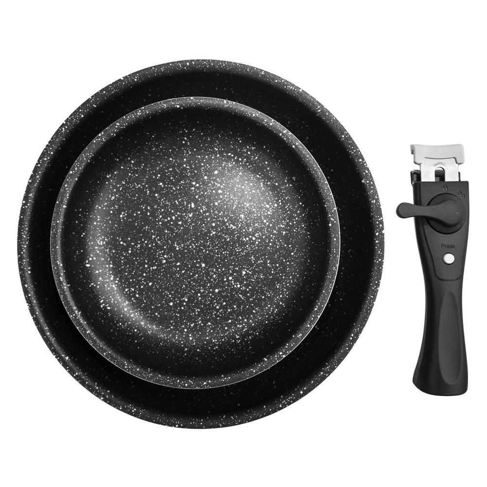 - W zestawie patelnia 20 cm, patelnia 26 cm, uniwersalny odpinany uchwyt.