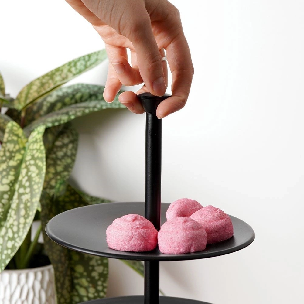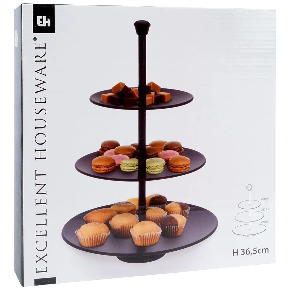 Trzypiętrowa patera do serwowania oraz ekspozycji. Świetnie prezentować się będą na niej babeczki, ciasteczka, różnego rodzaju desery jak również przystawki. Idealnie sprawdzi się do przygotowania słodkich stołów, dzięki niej w efektowny sposób wyeksponujemy na stole słodkości oraz słone przekąski. Sprawdzi się do użytku domowego oraz profesjonalnego. Wyprodukowano zgodnie z europejskimi standardami.