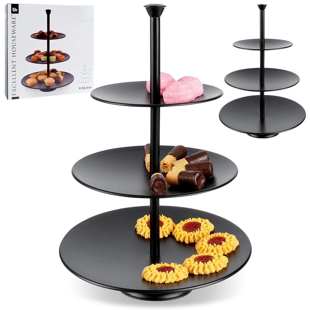 - 3 - POZIOMOWA - Wyposażona w trzy tace o różnych średnicach. Taca duża 25 cm, taca średnia 20,5 cm, taca mała16 cm. Dzięki trzem piętrom możemy pięknie wyeksponować umieszczone na niej produkty.