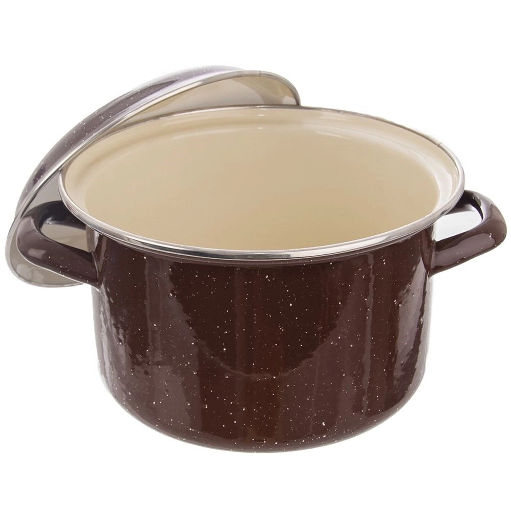 - Poręczny garnek z uchwytami oraz pokrywką, wykonany ze stali emaliowanej.