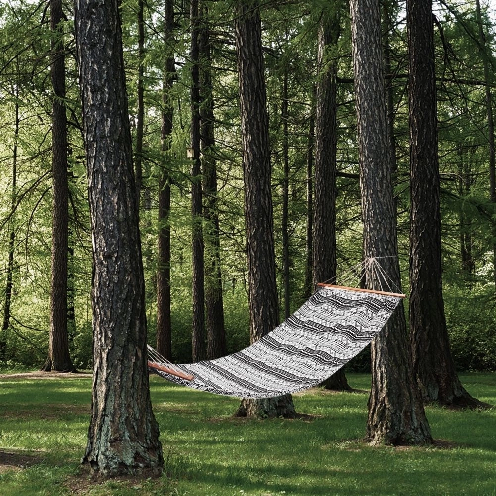 - KLASYCZNY WZÓR - Hamak utrzymany jest w modnej kolorystyce, która świetnie komponuje się z ogrodem. Hamak posiada ciekawy wzór w kolorze biało czarnym.