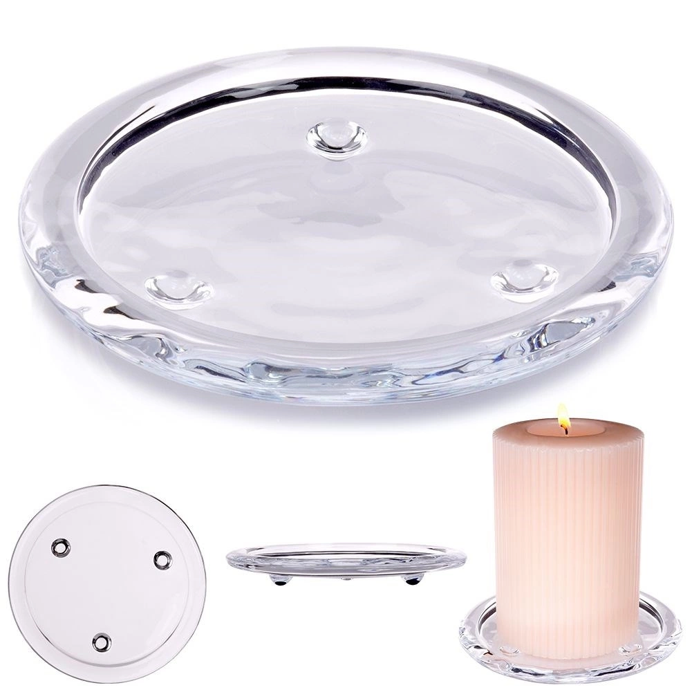 Szklana podstawka pod świecę. Posiada okrągły kształt i przezroczysty kolor. Wykorzystamy ją również jako podstawkę do tworzenia kompozycji dekoracyjnych. Dzięki niej ochronimy meble przed rozlaniem wosku podczas palenia świecy. Wyprodukowano zgodnie z europejskimi standardami.