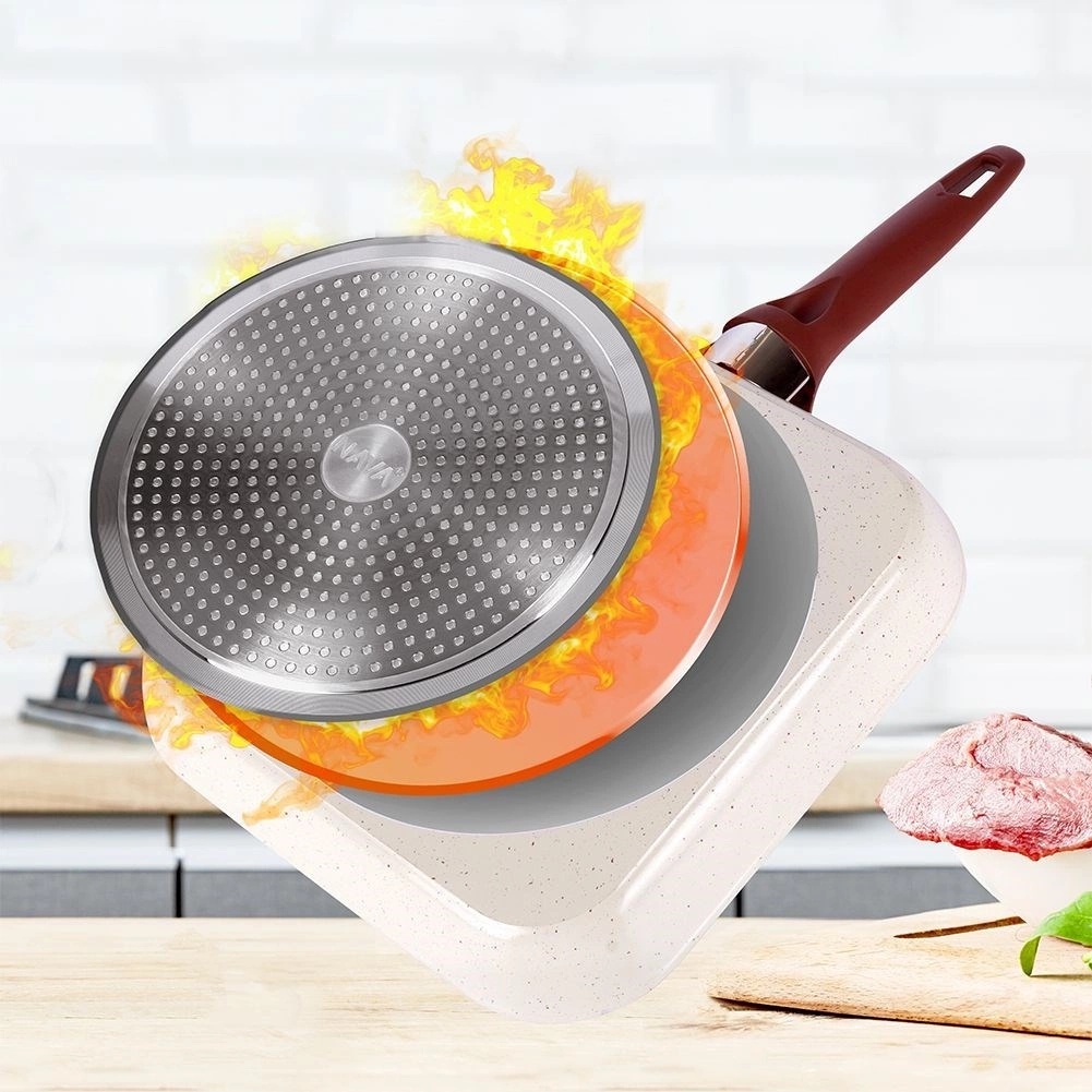 - NIEZAWODNA - Kwadratowa patelnia o wymiarze 27 x 27 cm została wykonana z aluminium, trzywarstwowej ceramicznej powłoki granitowej oraz stalowej wkładki indukcyjnej. Patelnia została zaprojektowana tak aby wytrzymać nagłe zmiany temperatury.