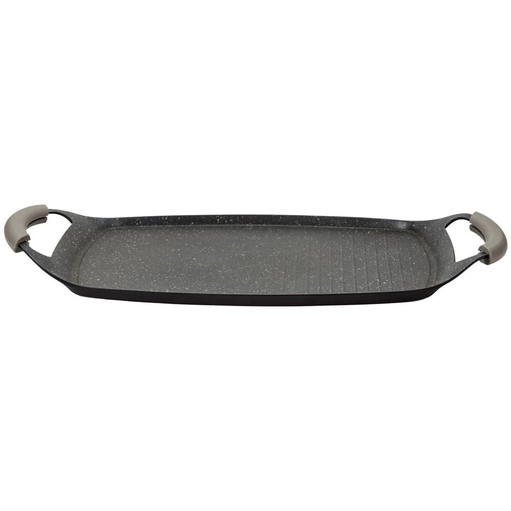 • PRAKTYCZNA - Płyta o wymiarze 48 x 29 cm przeznaczona do grillowania oraz smażenia. Połowa płyty jest płaska, druga ryflowana. Wyposażona w dwie silikonowe, ściągane nakładki ochronne na uchwyty.
