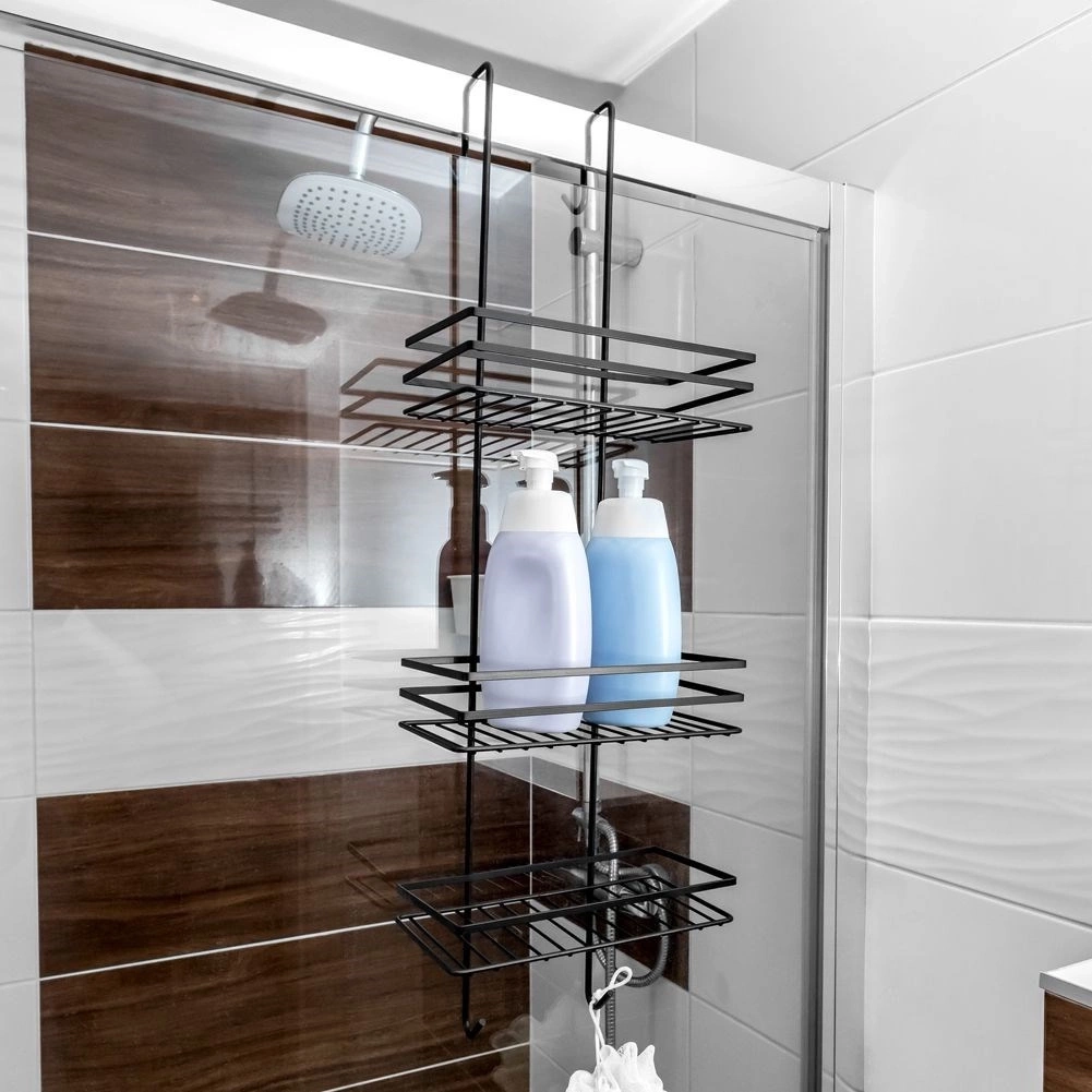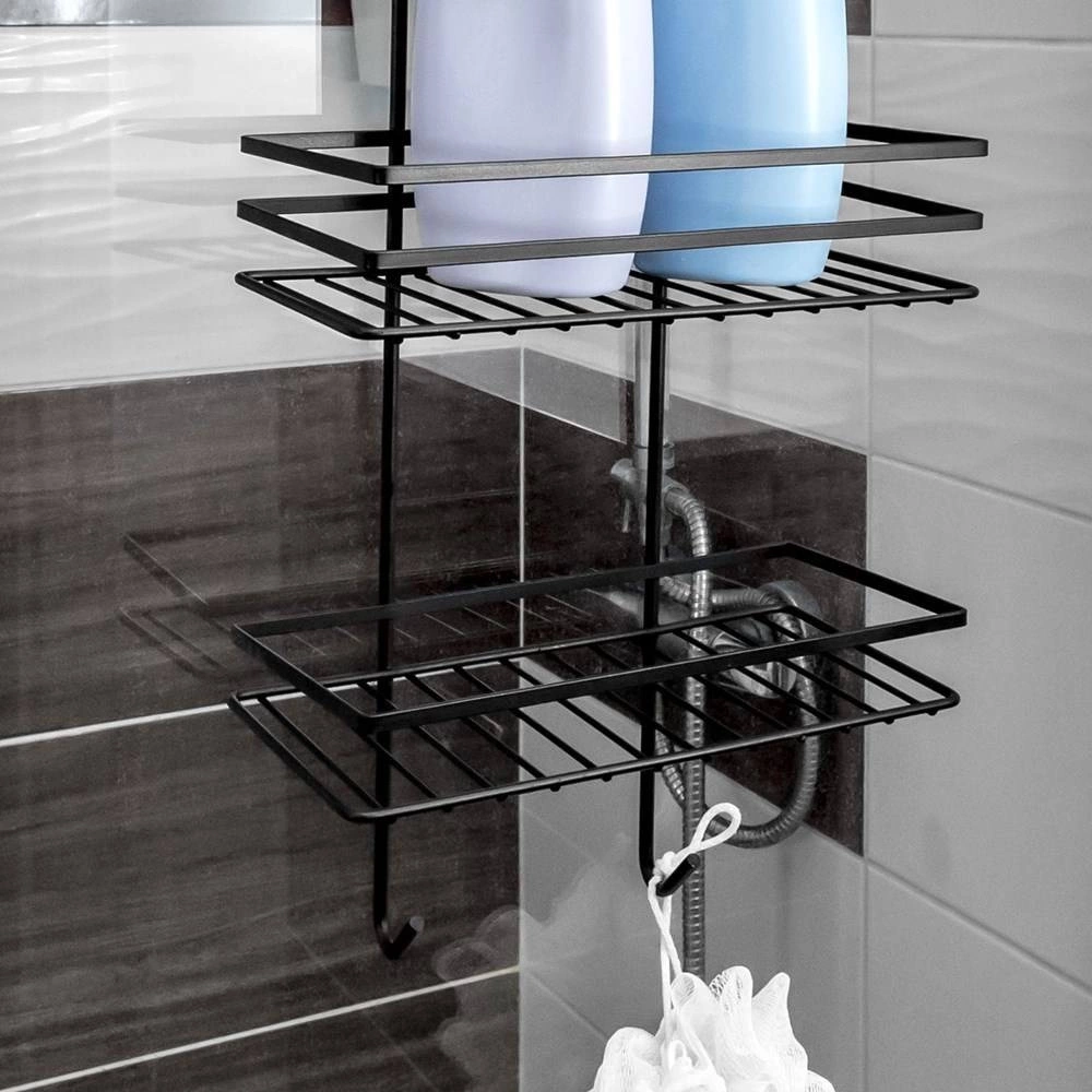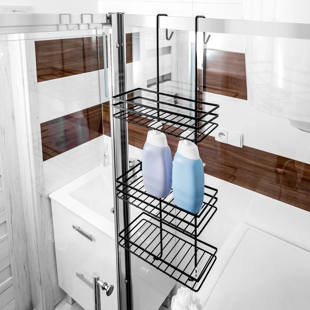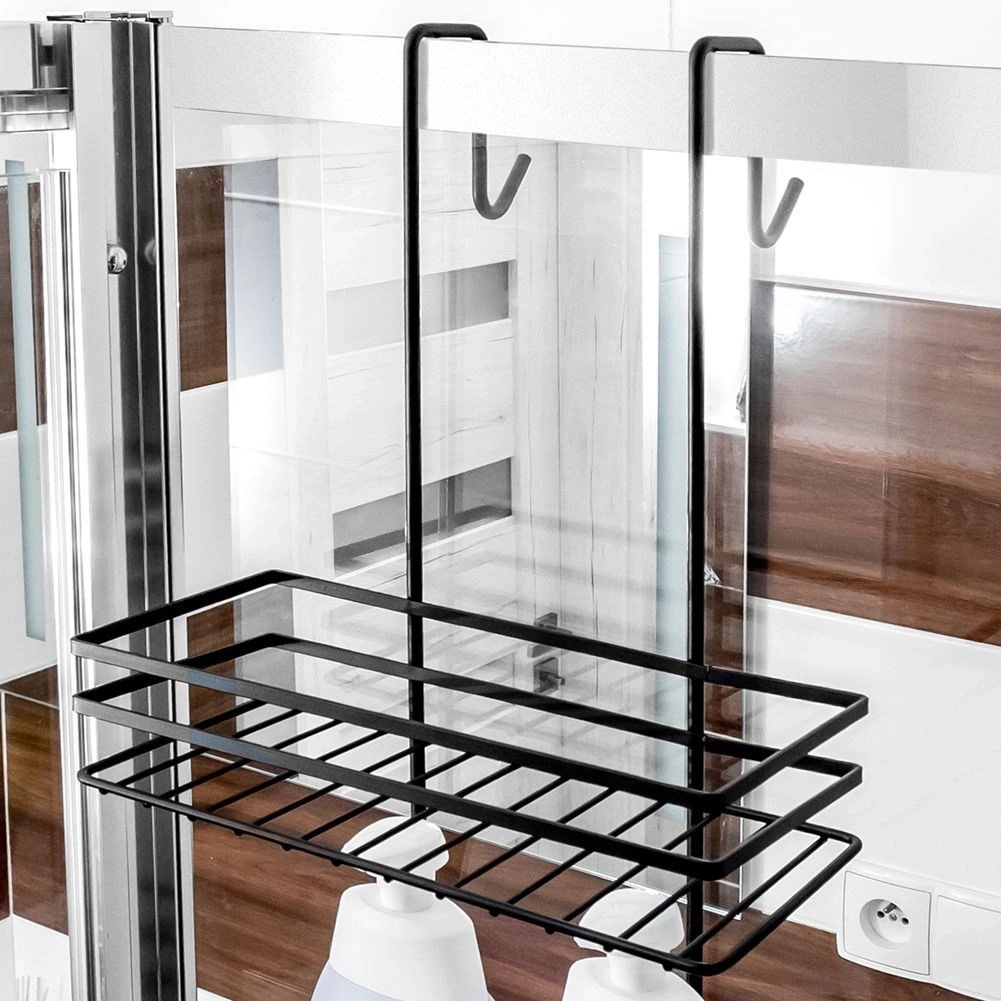 • Półka łazienkowa na kosmetyki i akcesoria łazienkowe zawieszana na szybie kabiny prysznicowej. Wykonana w całości z metalu, w modnym czarnym kolorze.