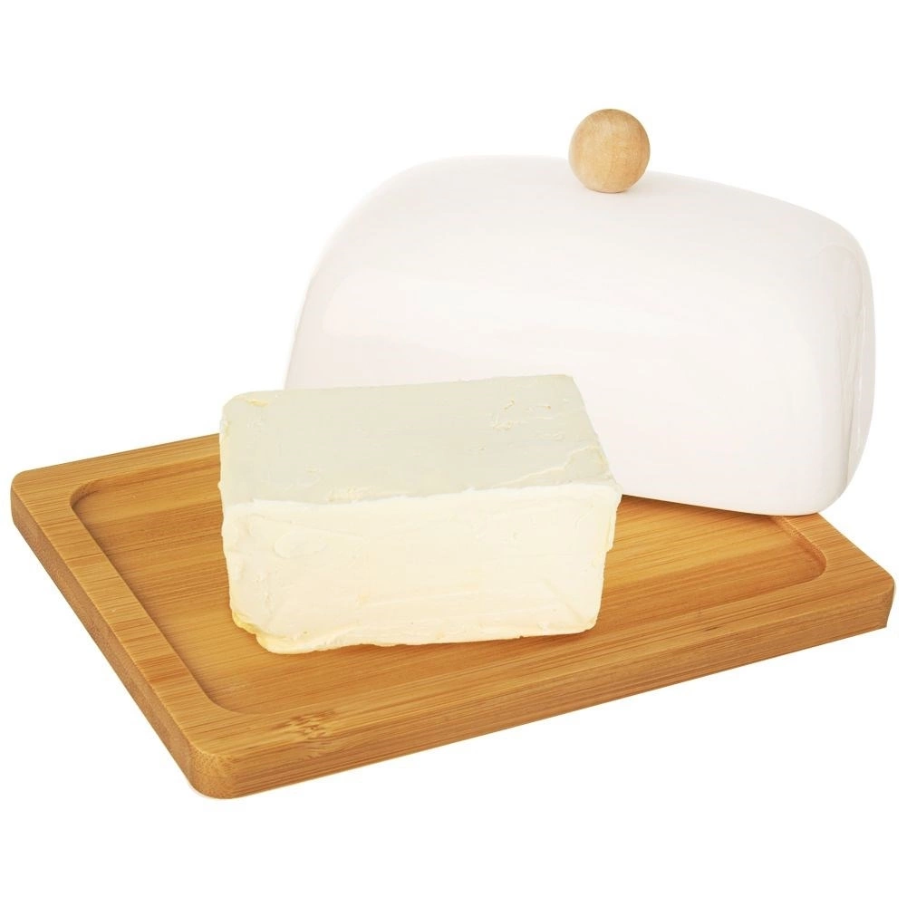 • Maselniczka do przechowywania i serwowania masła. Wykonana z białej porcelany oraz drewna bambusowego.