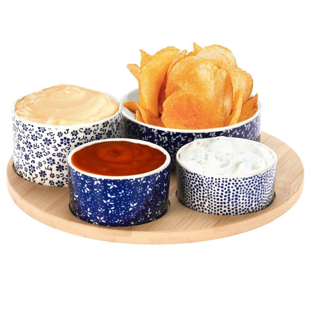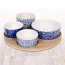 - PORCELANOWE - Zestaw czterech okrągłych miseczek wykonanych z porcelany na bambusowej tacy. Dzięki tacy serwowanie przekąsek będzie niezwykle proste.