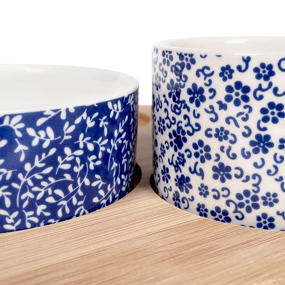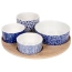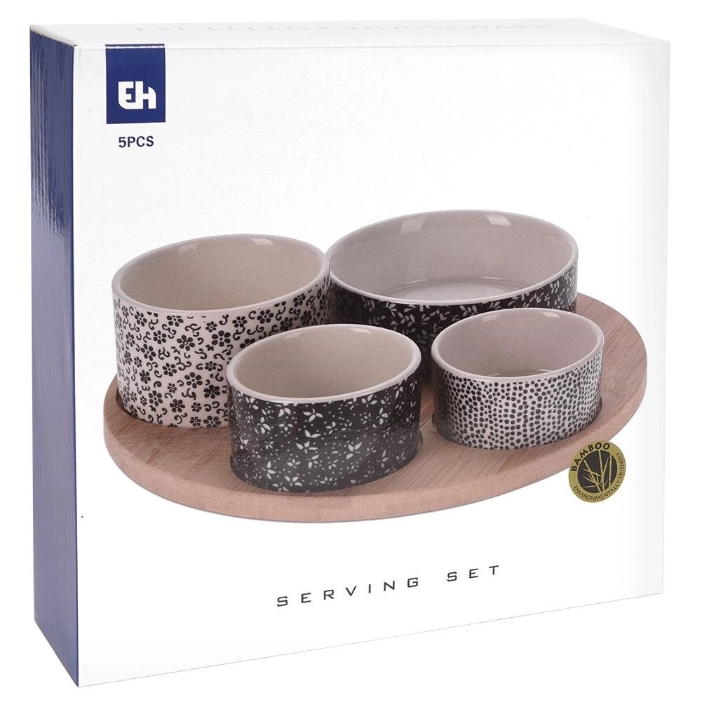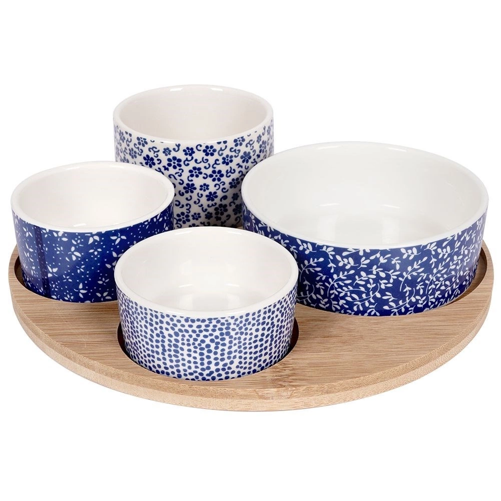 Zestaw czterech okrągłych miseczek wykonanych z porcelany na bambusowej tacy. Miseczki nie przemieszczają się dzięki wgłębieniom na tacy. W zestawie: deska bambusowa 22 x 1 cm, 2x miseczka 7 x 4 cm, miseczka 7,5 x 5 cm, miseczka 10,5 x 3,5 cm. Zestaw świetnie sprawdzi się na prezent np. z okazji parapetówki. Idealny do serwowania przekąsek, przystawek i sosów. Wyprodukowano zgodnie z europejskimi standardami.