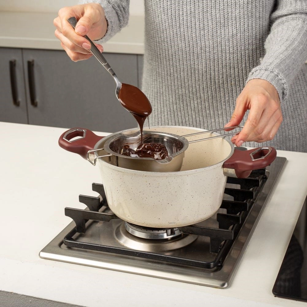 • WYGODNA - Wyposażona w długi uchwyt oraz specjalny haczyk, który pozwala wygodnie umieścić miskę w innym naczyniu. Dziubki po bokach ułatwiają przelewanie roztopionych składników. Nadaje się do wszystkich garnków o średnicy 14-24 cm.