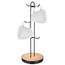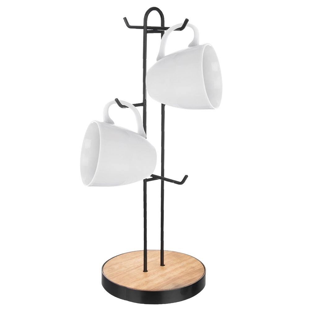 • Stojak na 6 kubków lub filiżanek. Wykonany z metalu w kolorze czarnym a podstawa z drewna. Dzięki niemu w piękny sposób wyeksponujesz ulubione kubki.