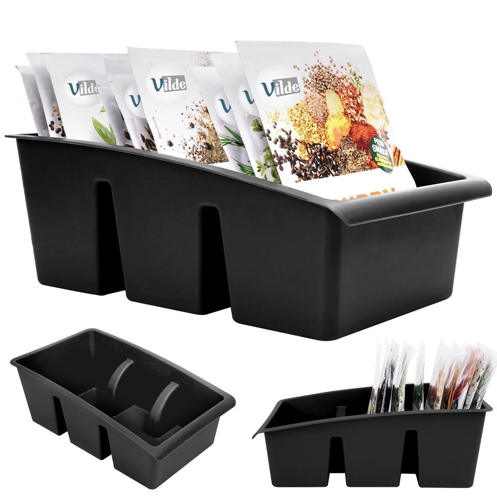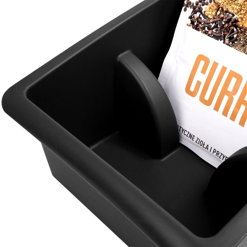 Pojemnik kuchenny na przyprawy w torebce. Solidnie wykonany z lekkiego tworzywa w kolorze czarnym. Z jego pomocą zapanuje porządek w szafce z przyprawami. Dzięki niemu posortujesz przyprawy i zawsze będziesz mieć dany produkt pod ręką. Szybko znajdziesz odpowiednią torebkę. Pojemnik pozwala utrzymać torebkę w przegródce, co zapobiega rozsypywaniu przypraw. Przyprawy i zioła będą utrzymane w porządku, a jeden organizer pomieści wiele torebek różnorakich produktów. Oryginalny produkt marki Vilde. Wyprodukowano zgodnie z europejskimi standardami.