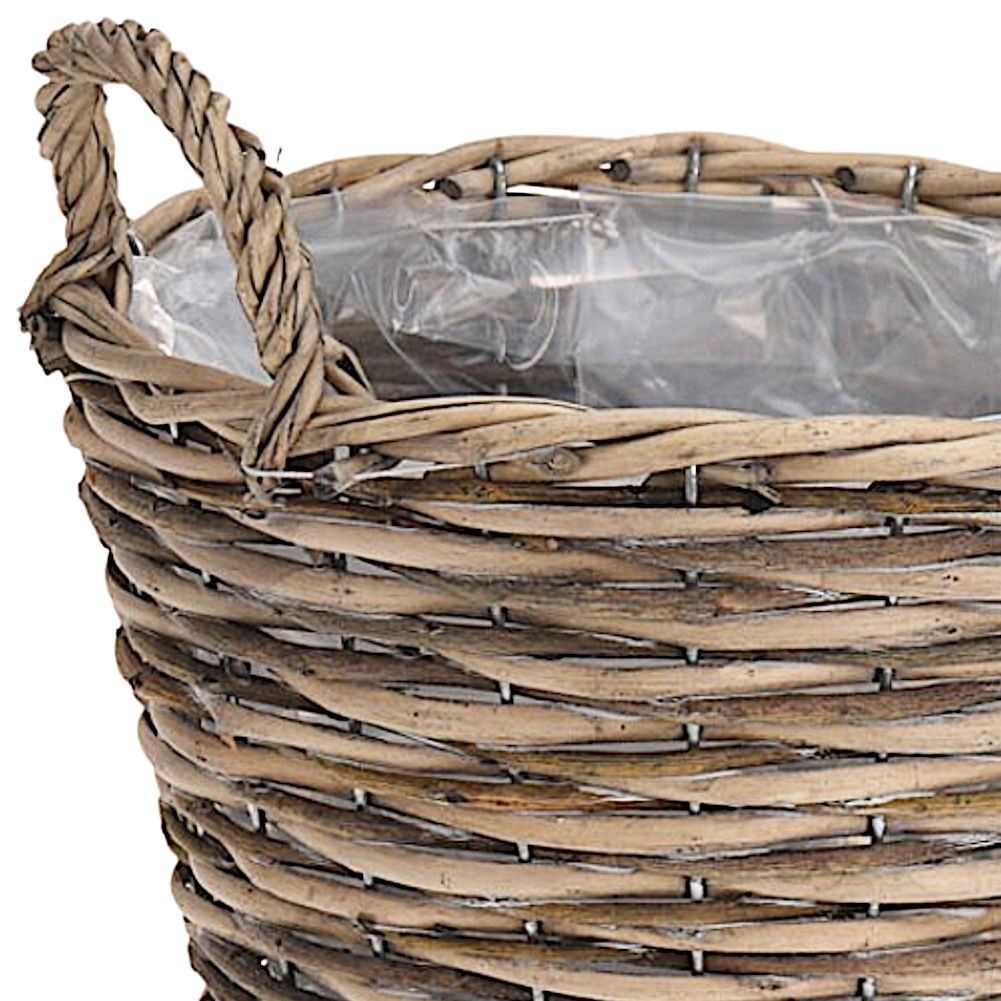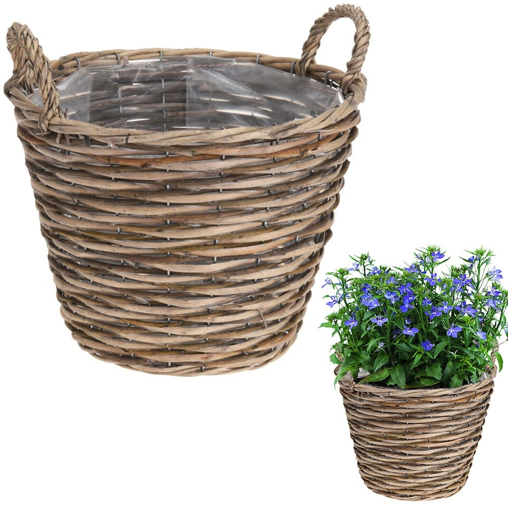 - ZABEZPIECZONA FOLIĄ - Wewnątrz wyłożona folią zapobiegającą wylewaniu nadmiaru wody. Dzięki czemu unikniemy zalania wikliny lub jej pobrudzenia od ziemi.