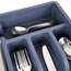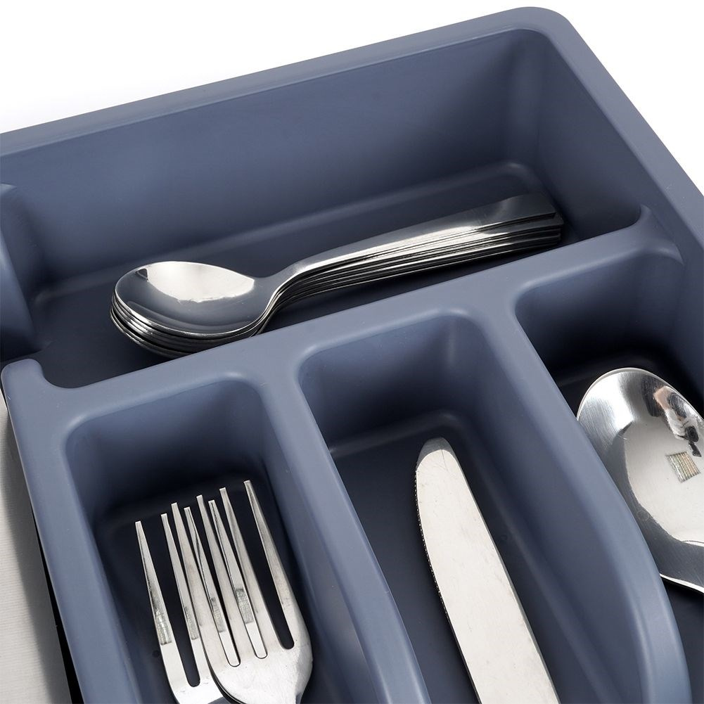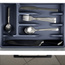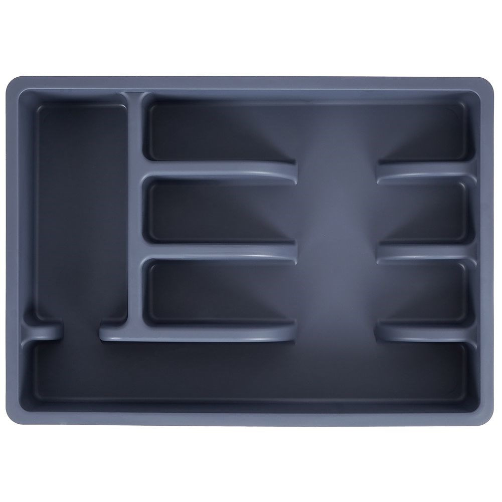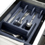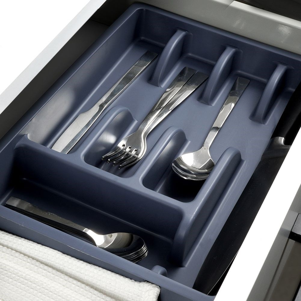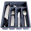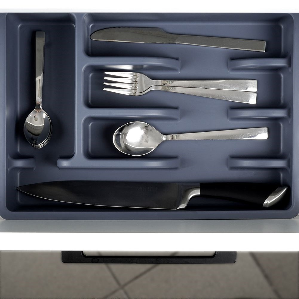 • Organizer na sztućce do szuflady. Wykonany z wysokiej jakości tworzywa w grafitowym kolorze. Łącznie posiada 5 przegródek na sztućce, łyżeczki oraz przybory kuchenne.