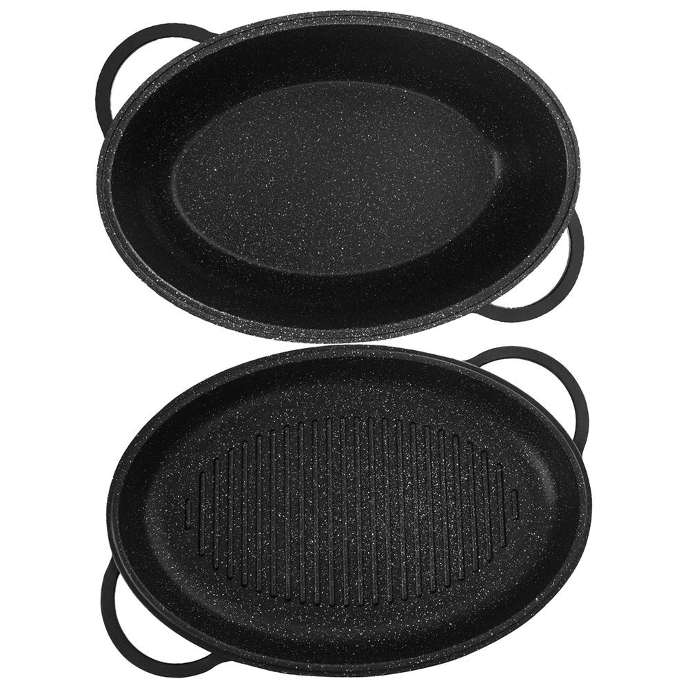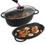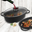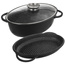 • PRZYDATNA - Zestaw składający się z owalnej brytfanny o pojemności 10 litrów z pokrywą w formie patelni grillowej oraz pokrywą ze szkła żaroodpornego. Niezwykle przydatny w każdej kuchni do smażenia, pieczenia oraz duszenia potraw. Wykorzystamy ją również do pieczenia gęsi, dzięki jej dużej pojemności. Wymiary brytfanki wraz z pokrywką bez uchwytów wynoszą 40 x 28 x 18 cm, uchwyty mają wymiary 5 x 12 cm. Patelnia grillowa ma wymiary wewnętrzne 38 x 25 x 6 cm.