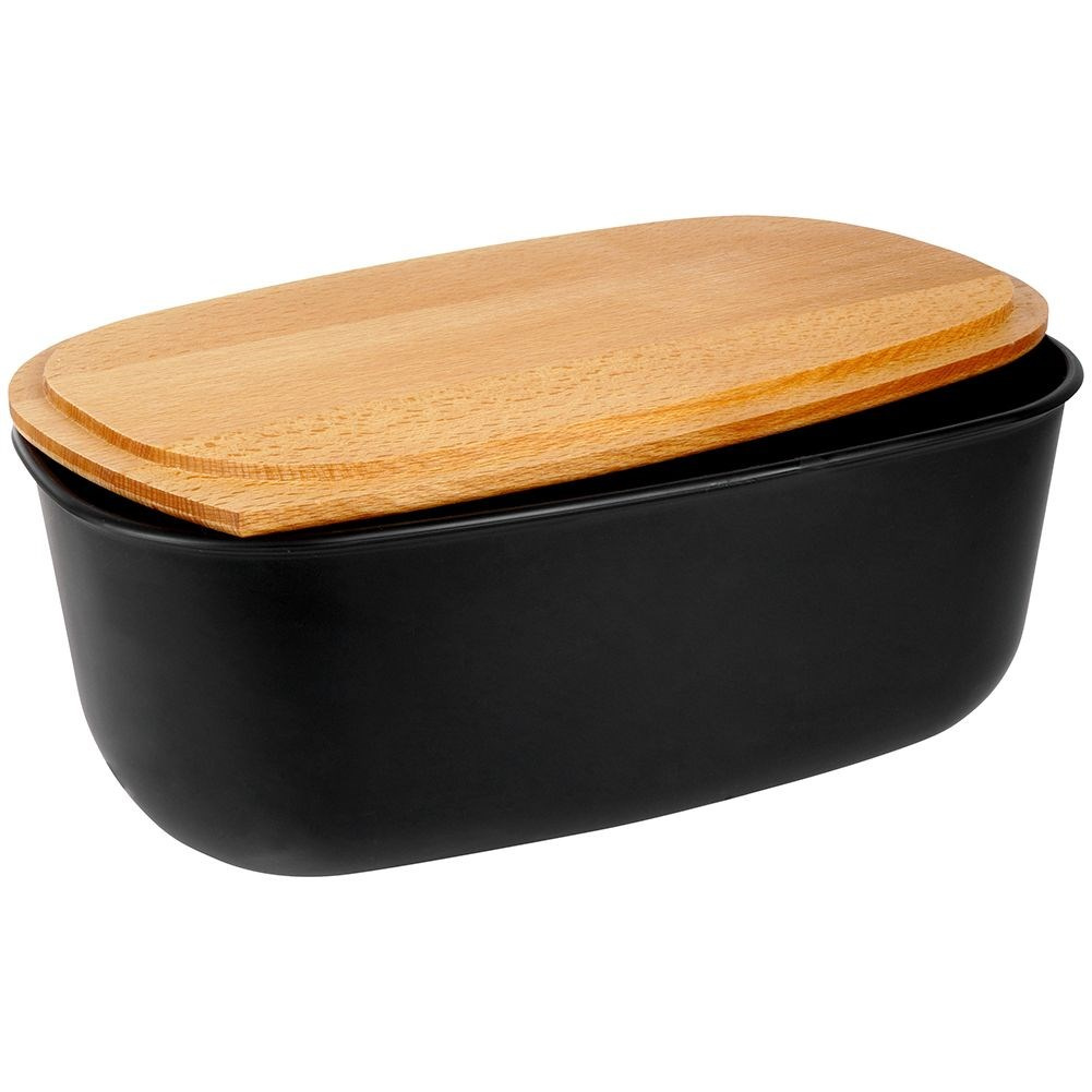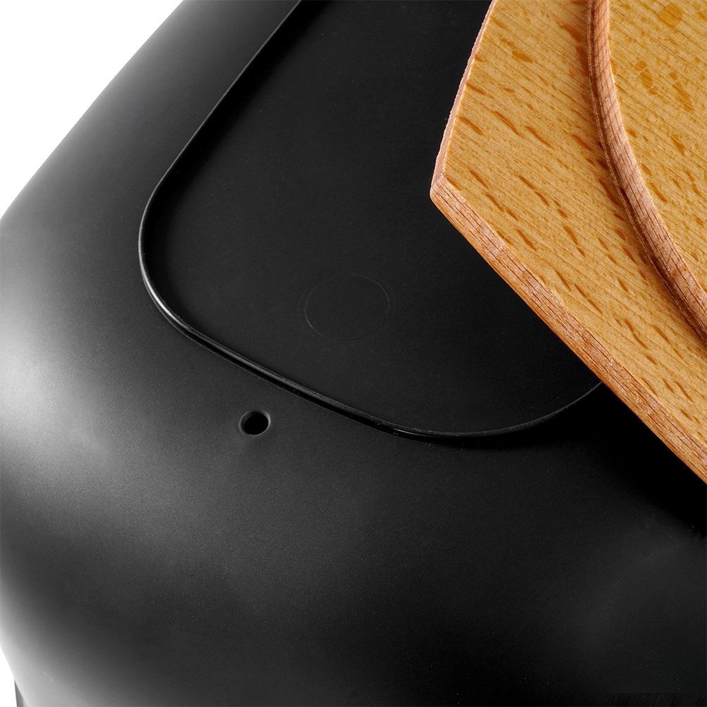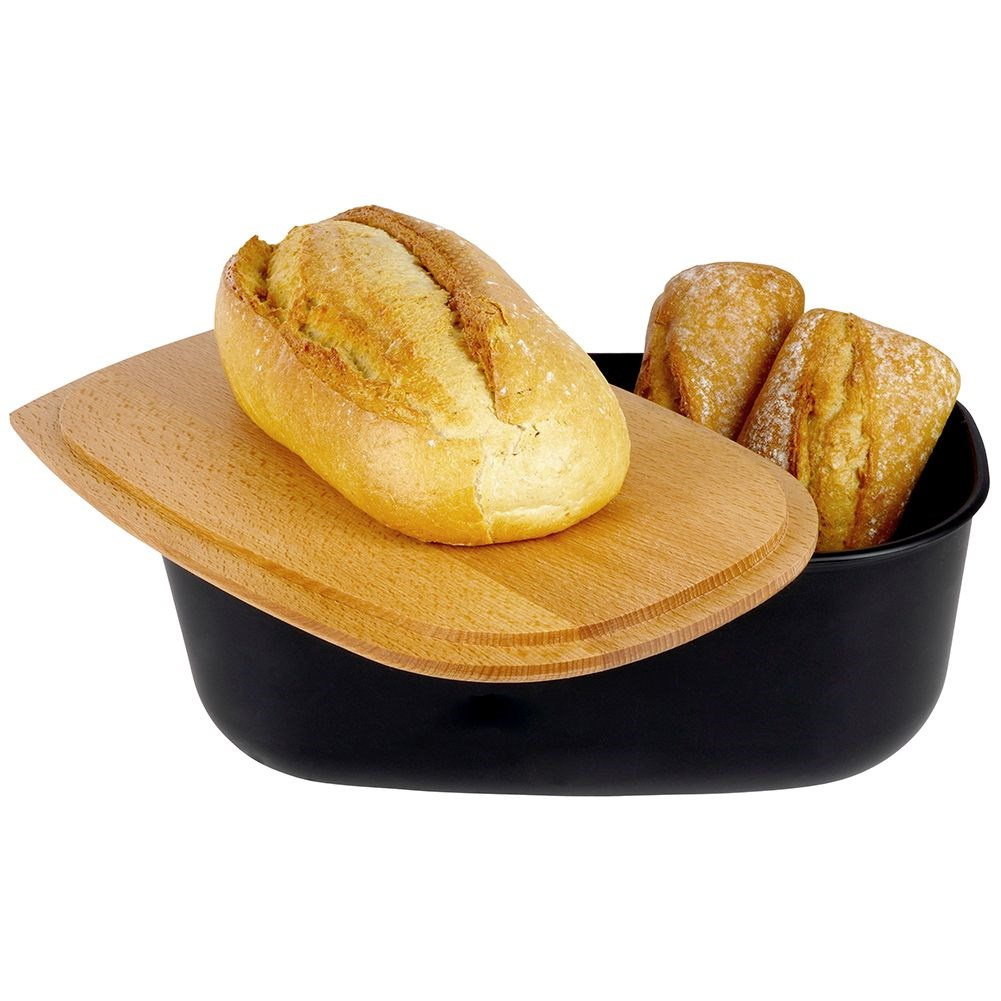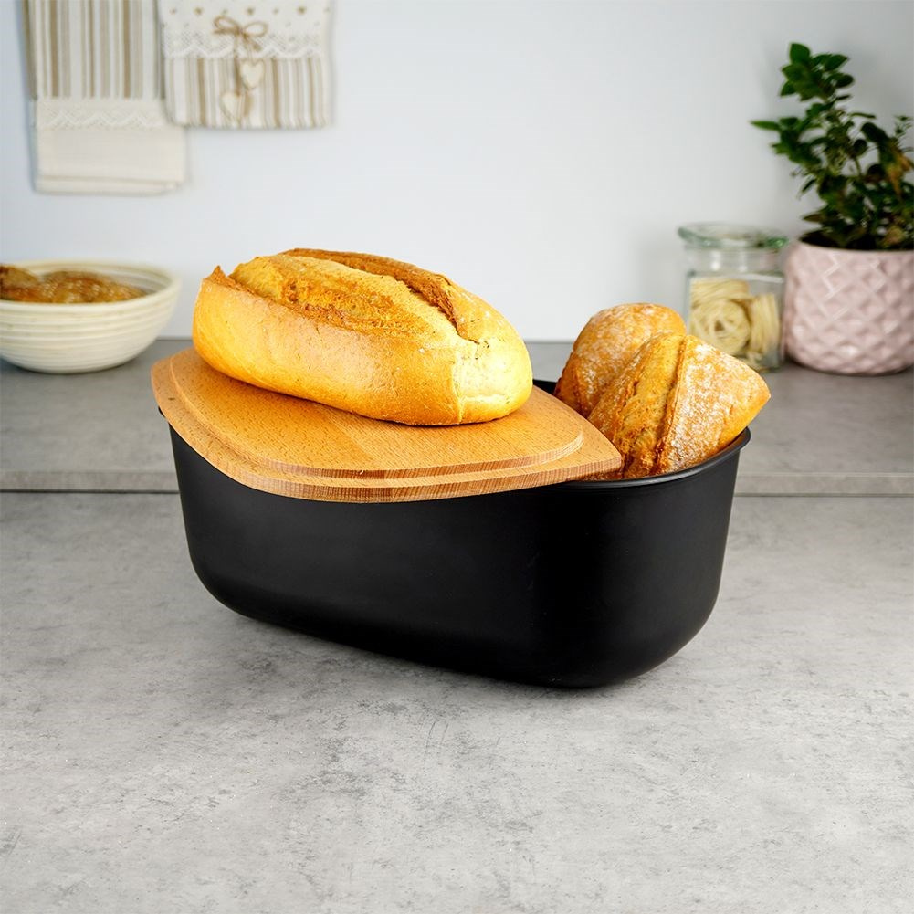 • Pojemny chlebak wykonany z wysokiej jakości tworzywa w czarnym kolorze. Posiada pokrywę w formie drewnianej deski, którą wykorzystamy do krojenia pieczywa.