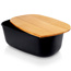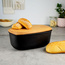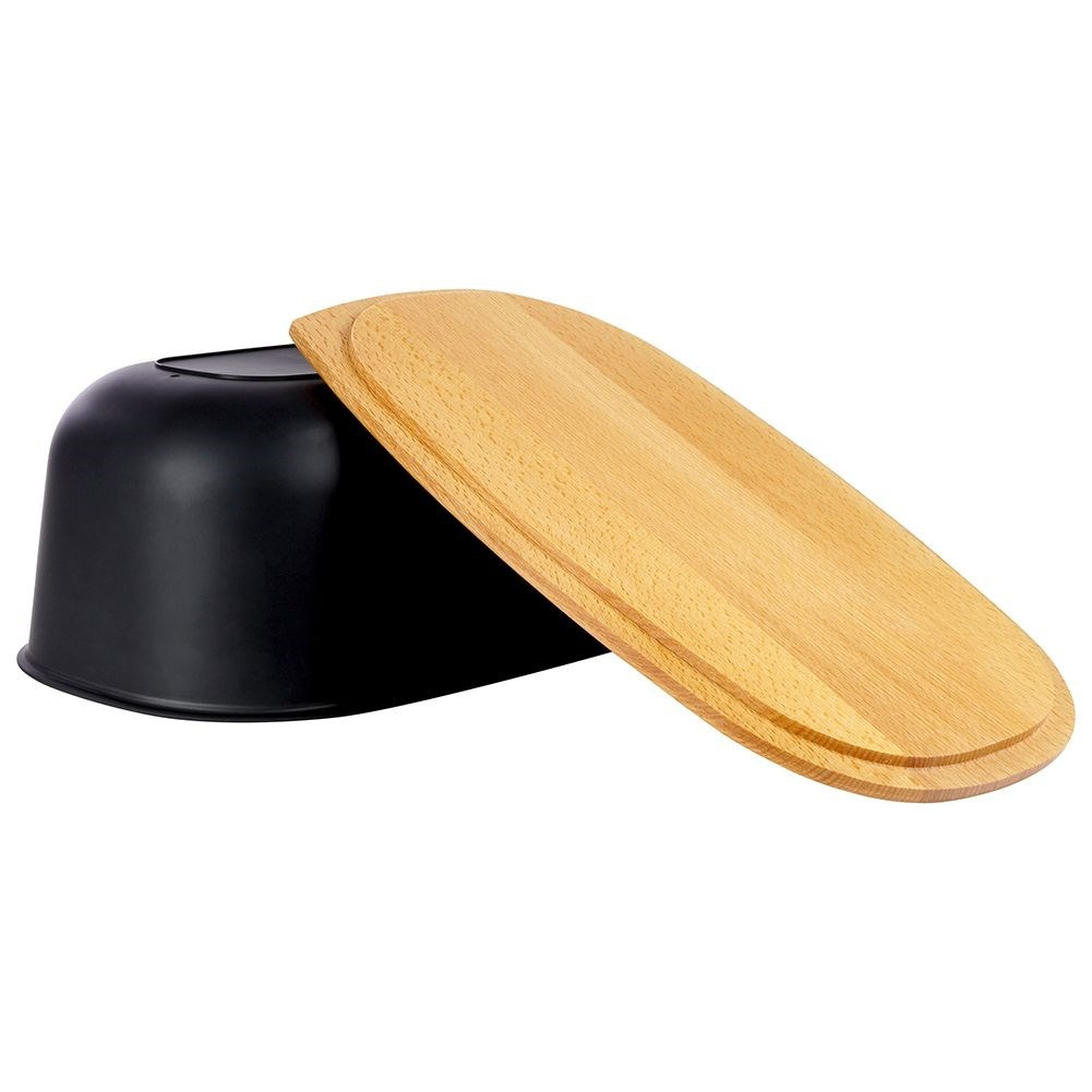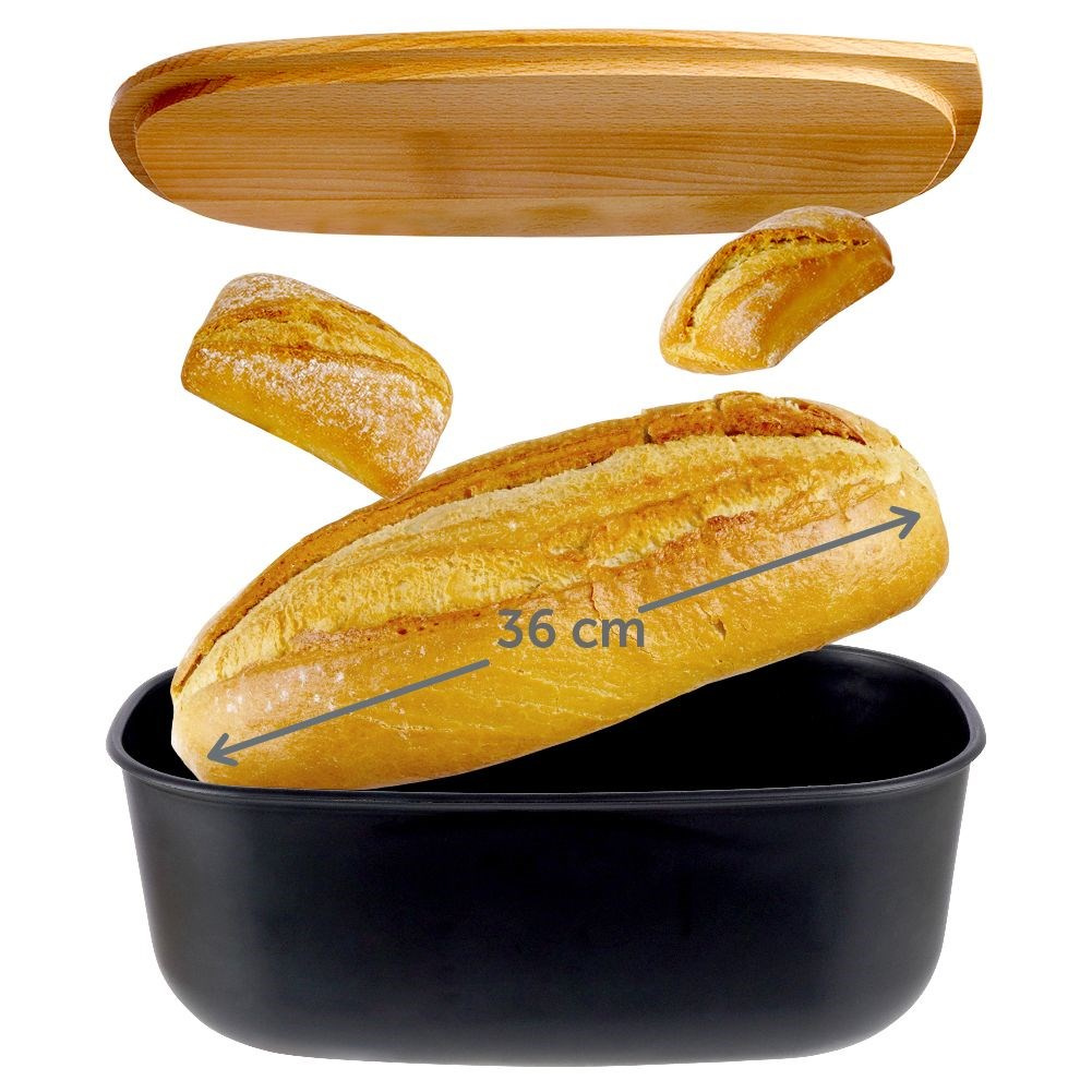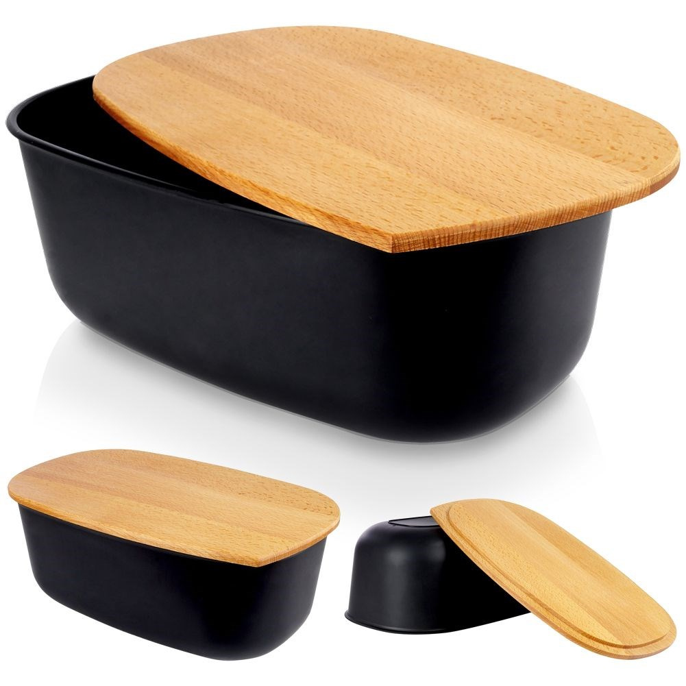 • Pojemny chlebak wykonany z wysokiej jakości tworzywa w czarnym kolorze. Posiada pokrywę w formie drewnianej deski, którą wykorzystamy do krojenia pieczywa.
