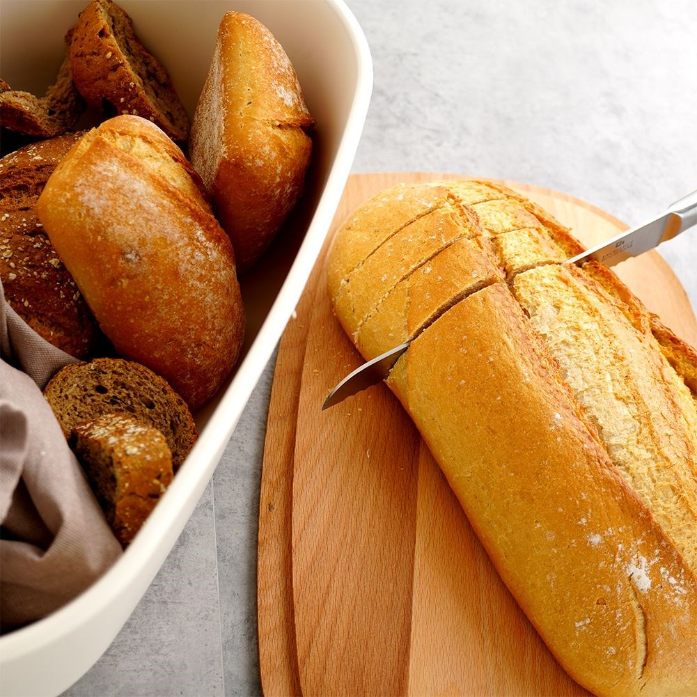 - POJEMNY - Chlebak jest pojemny - mieści każdy rodzaj pieczywa. Chlebak nadaje się do mycia w zmywarce do naczyń bez deski.