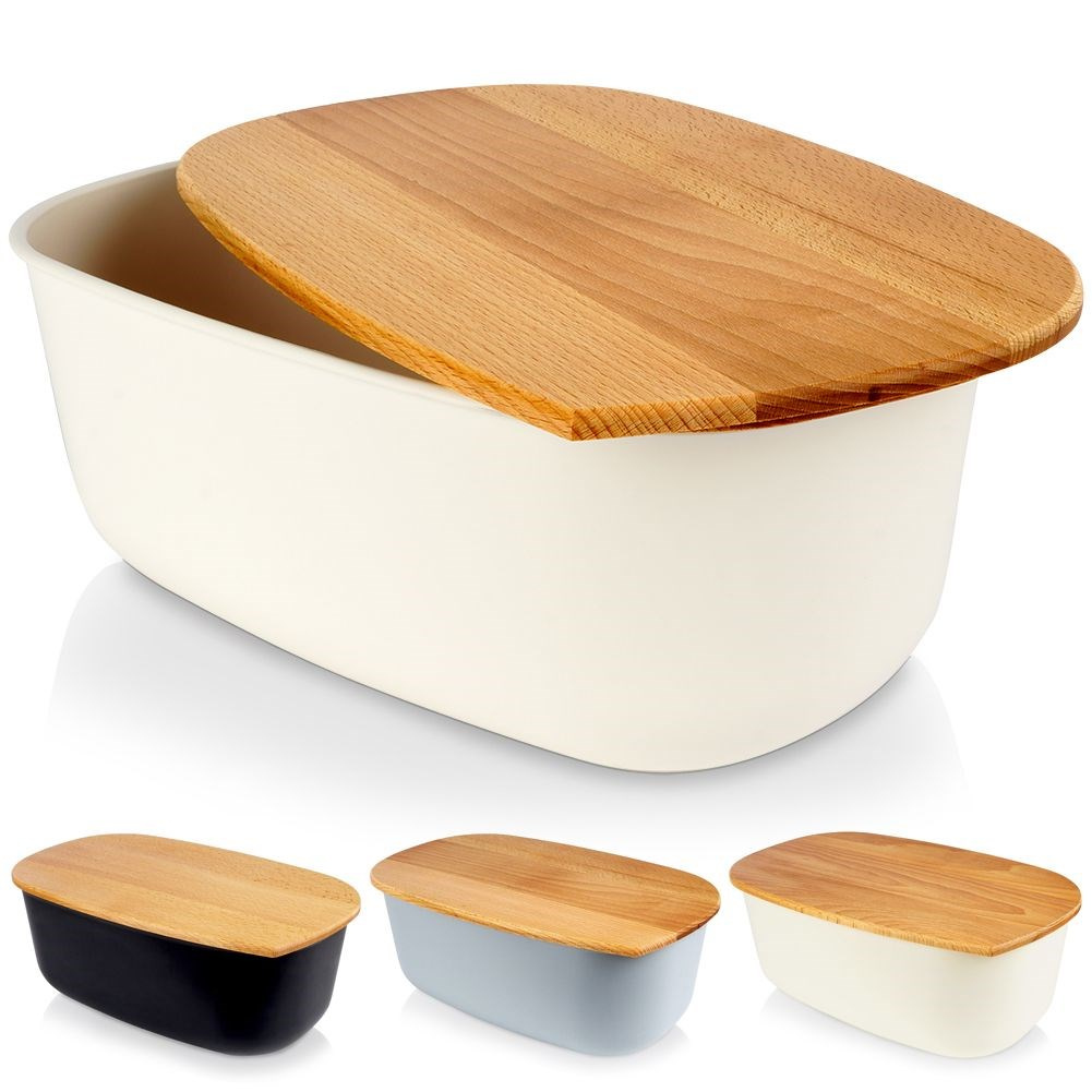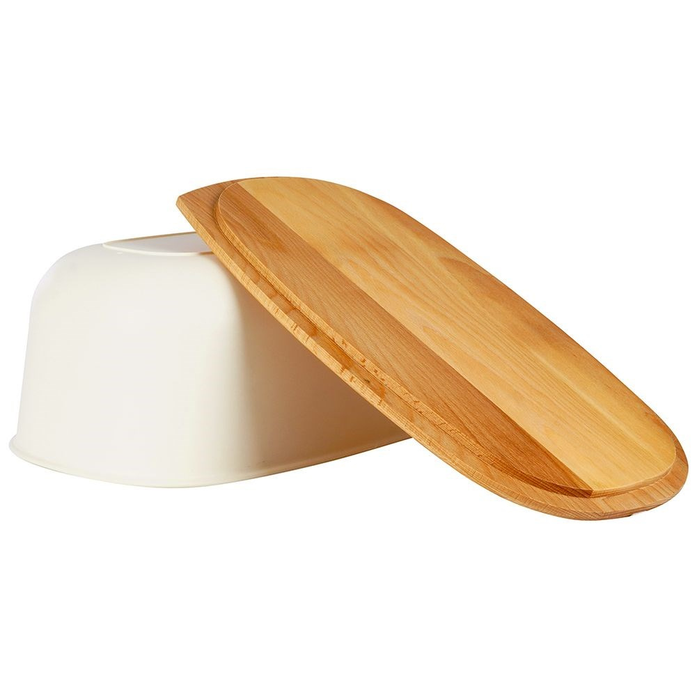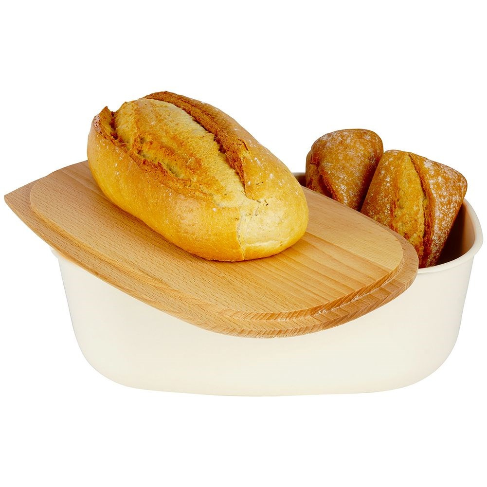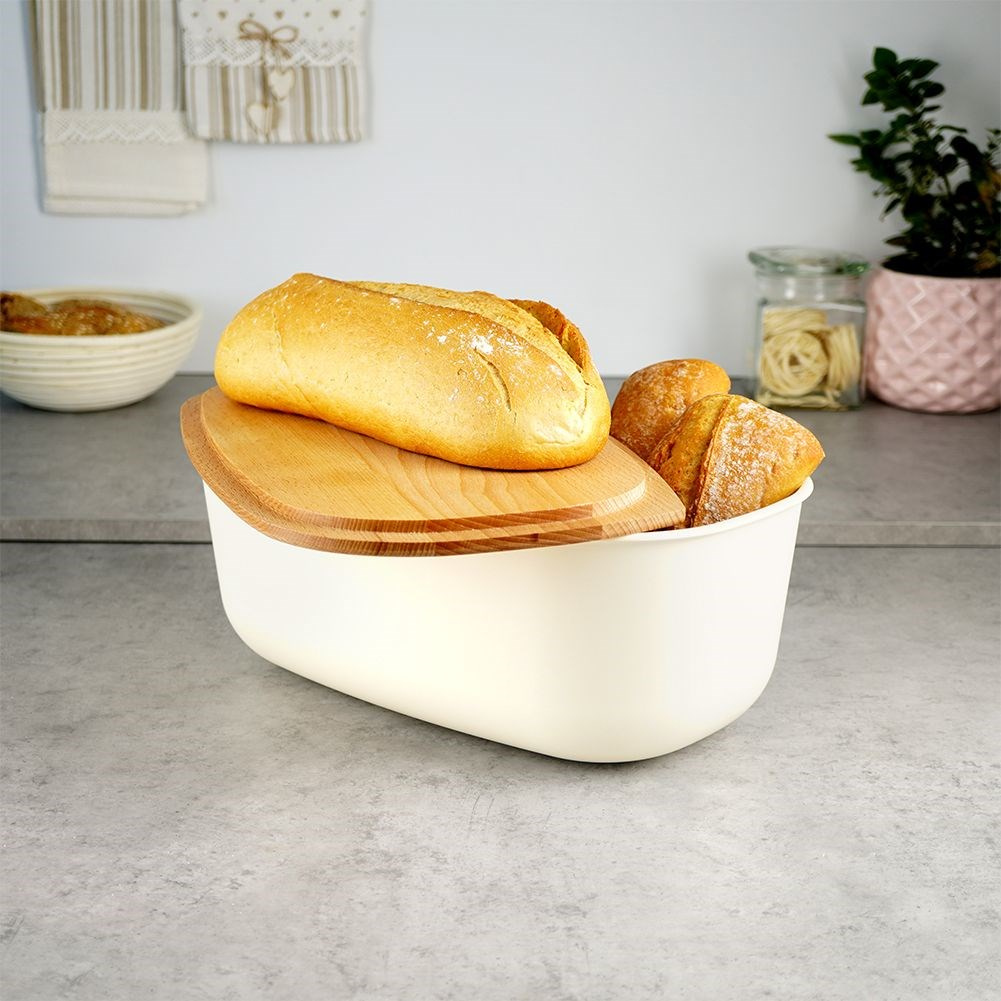 Pojemny chlebak o nowoczesnym wzornictwie. Posiada praktyczne zamknięcie w formie deski wykonanej z drewna, dzięki czemu możemy wykorzystać ją do krojenia pieczywa. Niezwykle efektownie prezentuje się w kuchni. Dzięki dużej pojemności pomieści różne rodzaje pieczywa. Prosty klasyczny wzór sprawi, że pasuje do każdego wnętrza. Deskę zalecamy dwukrotnie naoliwić olejem rzepakowym lub oliwą z oliwek, nadmiar zetrzeć i pozostawić na kilka godzin. Następnie umyć dokładnie w gorącej wodzie, wytrzeć i pozostawić do całkowitego wyschnięcia. Dzięki temu zabiegowi deska będzie mniej chłonąć wilgoć i dłużej utrzyma swój prawidłowy kształt. Deski nie wolno myć w zmywarce.