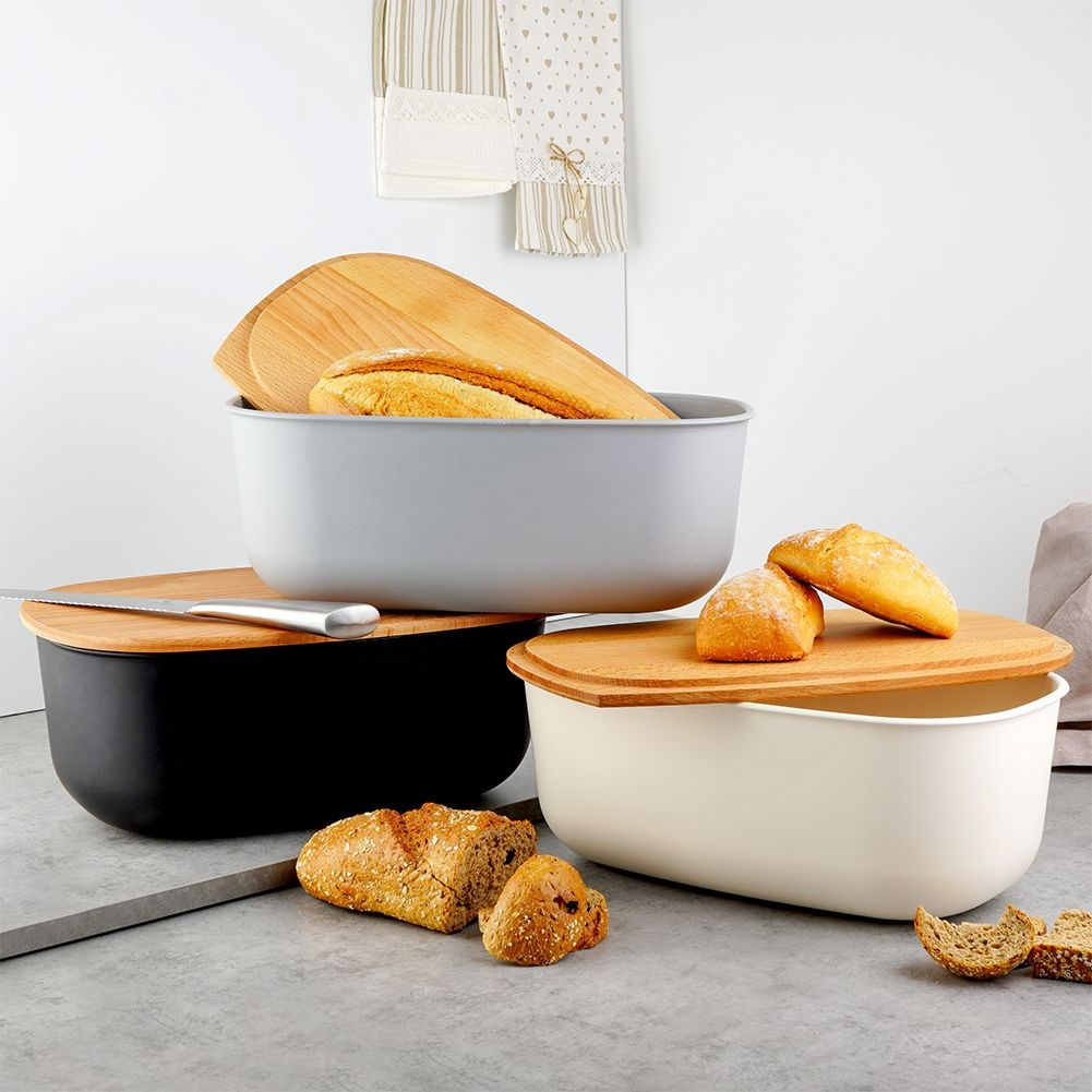 - STYLOWY - Chlebak wykonany z wysokiej jakości tworzywa wolnego od BPA w szarym, matowym kolorze. Chlebak ma wymiary zewnętrzne: 39 x 23,5 x 15,5 cm.