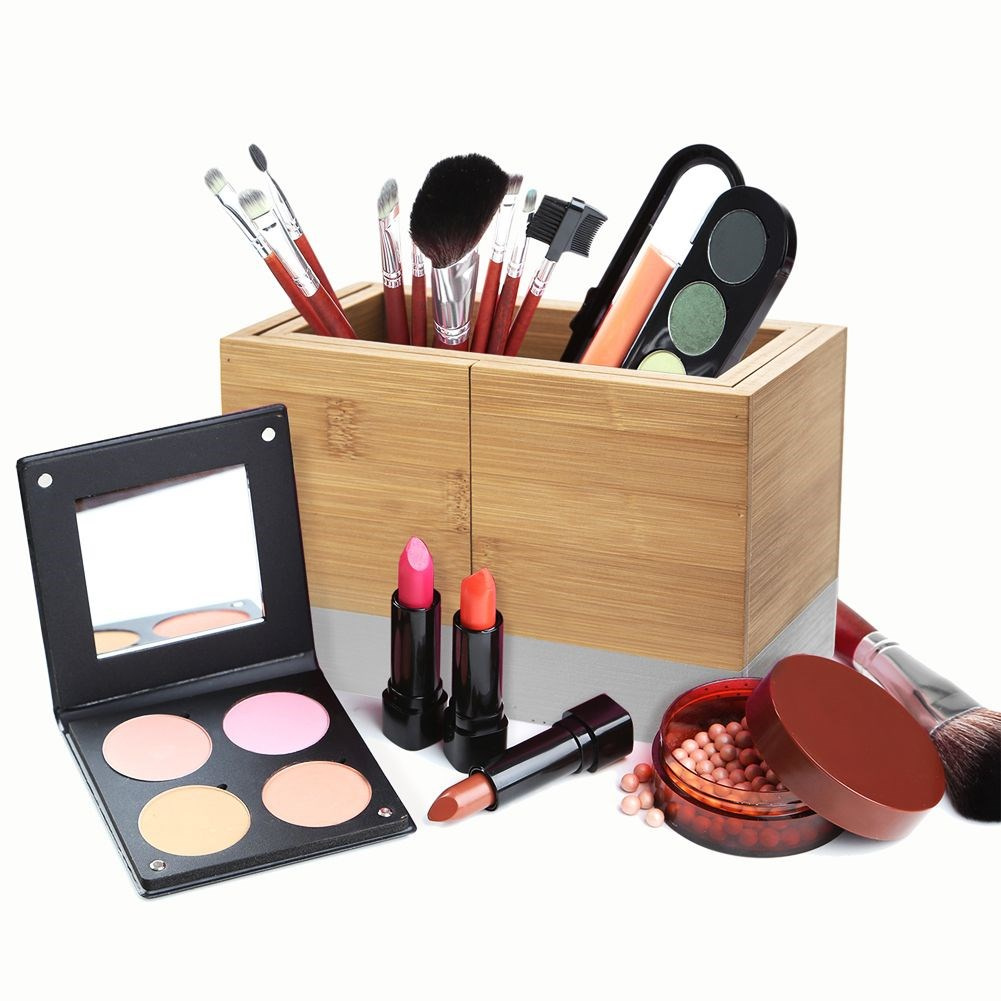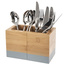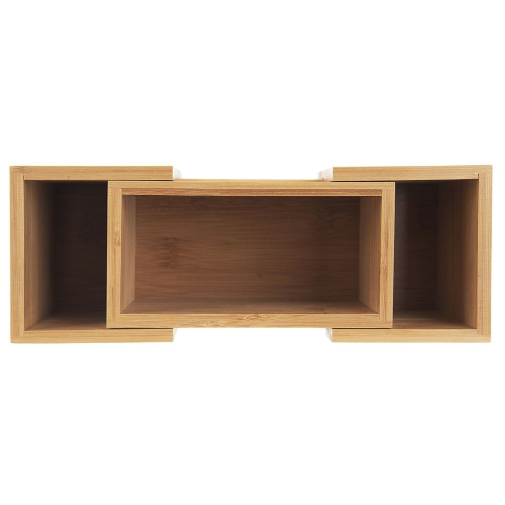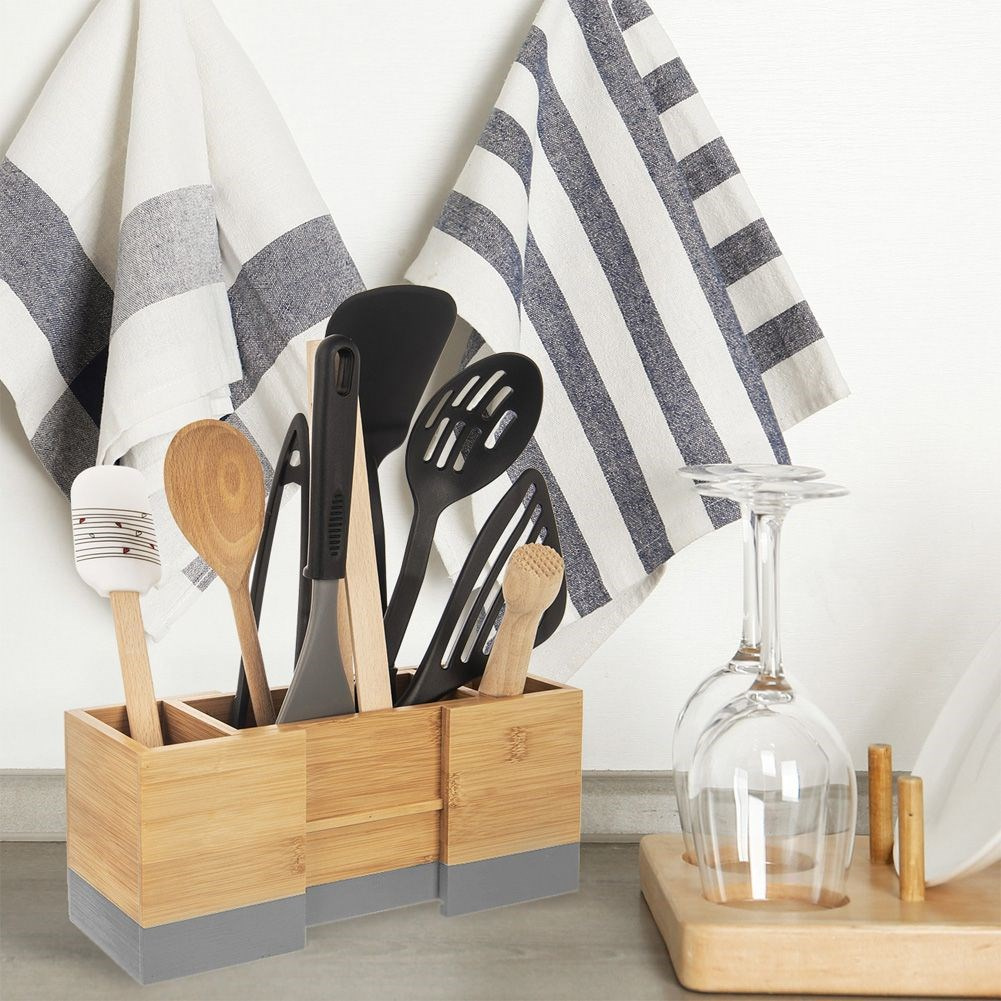 - BAMBUSOWY - Stojak na sztućce i przybory kuchenne. Możemy wykorzystać go również jako organizer np. na akcesoria do makijażu. Wykonany z drewna bambusowego, dolna część stojaka pomalowana jest na kolor szary. Pojemnik ma wymiary po rozłożeniu: 27 x 10 x 12 cm, a po złożeniu 18,2 x 10 x 12 cm.