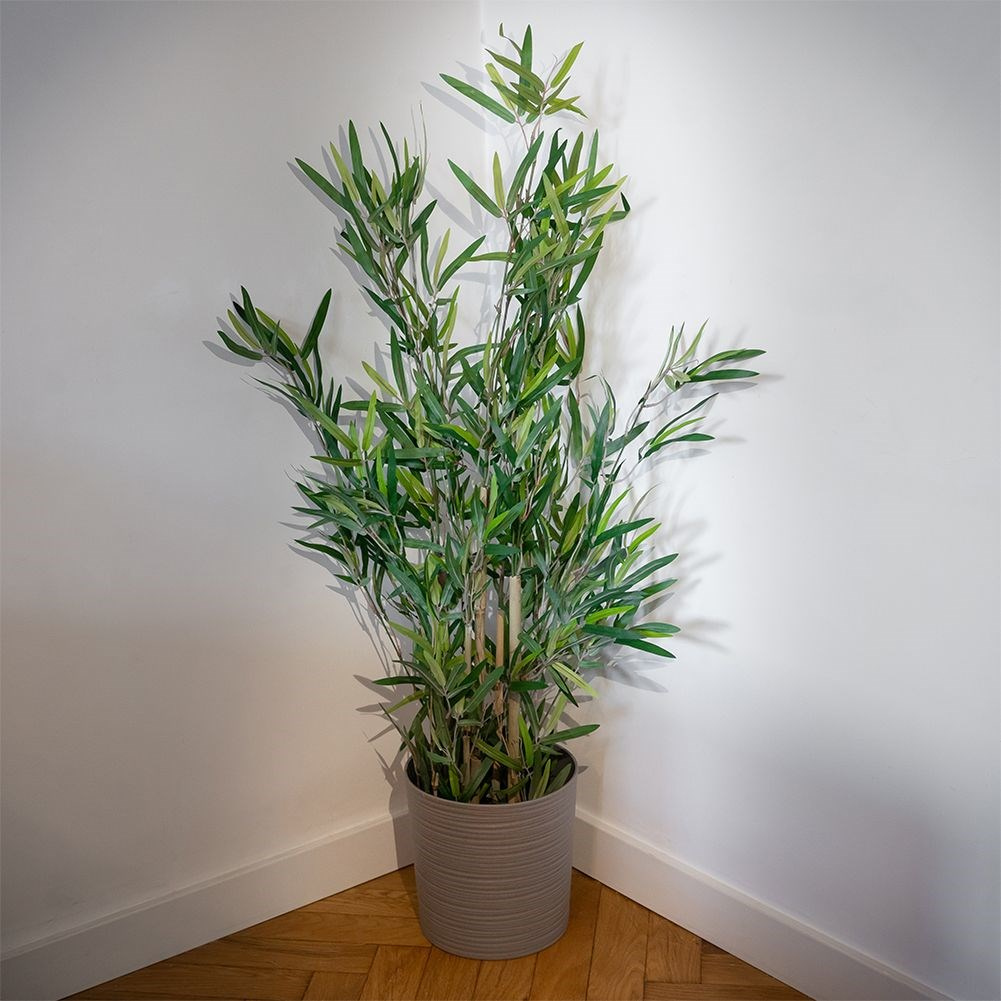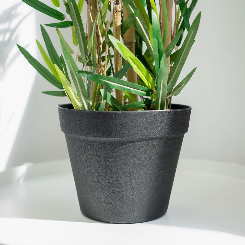 Sztuczny bambus w doniczce. Roślina prezentuje się bardzo efektownie a jej wygląd jest bardzo realistyczny. Posiada piękny zielony kolor i umieszczona jest w doniczce. Sztuczna roślina świetnie sprawdzi się w miejscach w których ciężko utrzymać żywe rośliny. Bambus wykonany jest z dbałością o każdy detal a jej utrzymanie jest niezwykle łatwe i nie zajmuje dużo czasu. Będzie efektownym dodatkiem dekoracyjnym w każdym pomieszczeniu. Podane wymiary mogą nieznacznie różnić się w każdej z roślin, wymiar zależy od odpowiedniego ułożenia liści. Wyprodukowano zgodnie z europejskimi standardami.